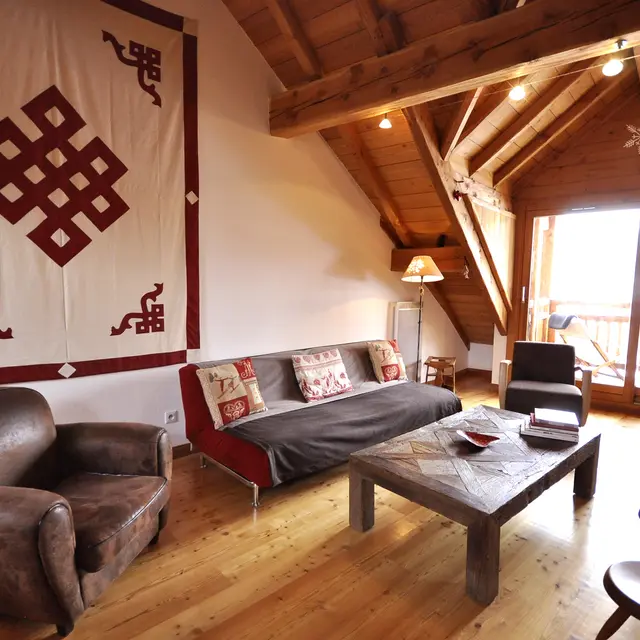 Ce très bel appartement chalet se situe au dernier étage que vous atteignez très facilement. Idéal pour 2 à 3 couples avec enfants, accueil possible jusqu’à 12 personnes.
