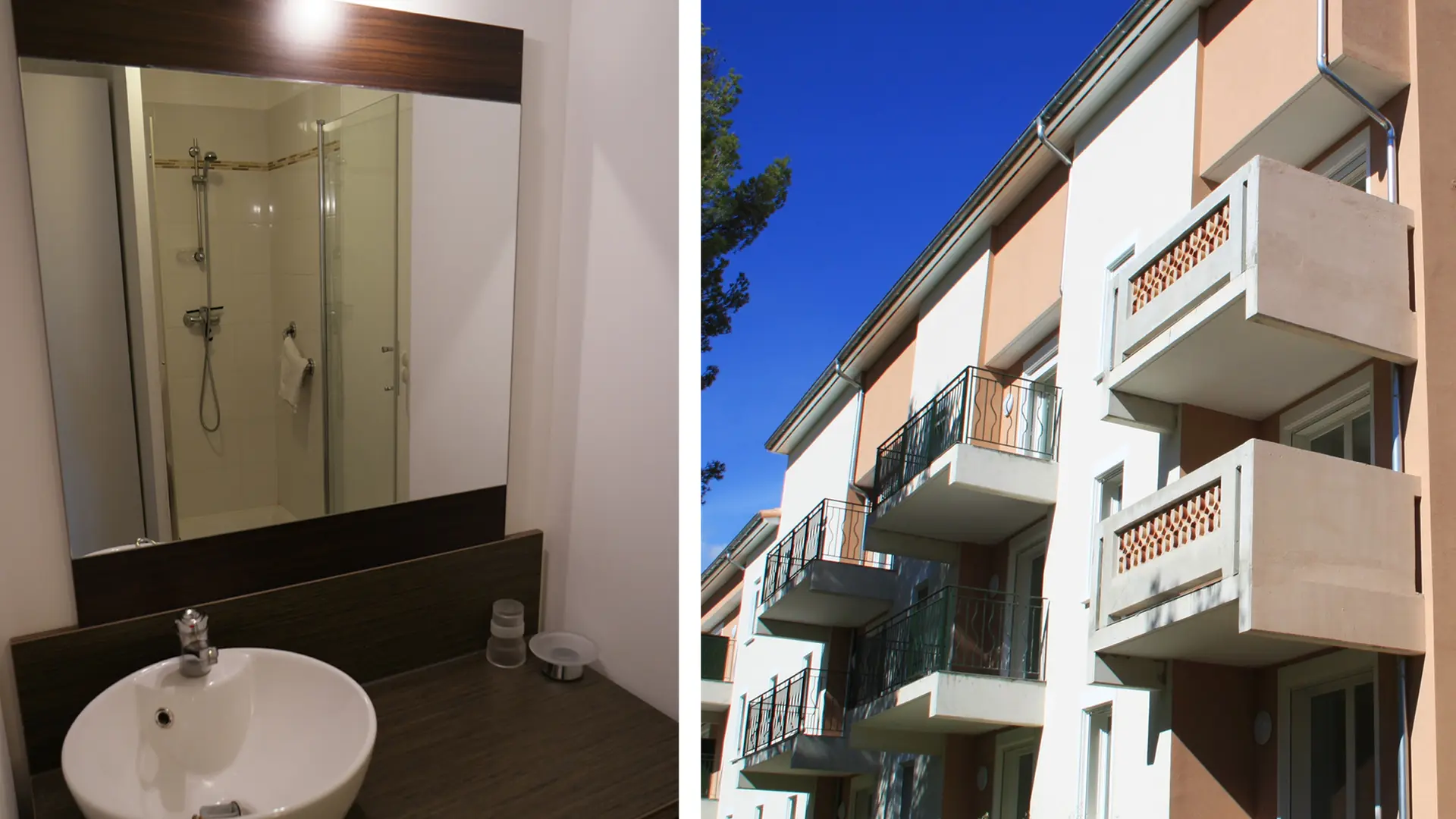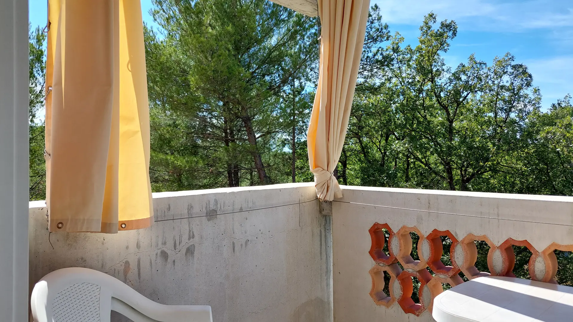 La résidence Lou San Peyre (appelée aussi Côté Provence II) est au calme en retrait de l’avenue des Thermes en sortant en direction de Riez. Elle est composée de deux bâtiments séparés d’un magnifique jardin provençal. Vous accédez à l’appartement au premier étage du rez-de-chaussée par l’ascenseur ou par l’escalier. La résidence Lou San Peyre est entourée d’un parc et d’une forêt. Le balcon est orienté vers l’ouest. Il donne sur le parc d’une résidence pour seniors. Vous avez vue sur les montagnes qui se trouvent de l’autre côté du Verdon et vous voyez à travers les arbres du parc le village avec le château des Templiers.