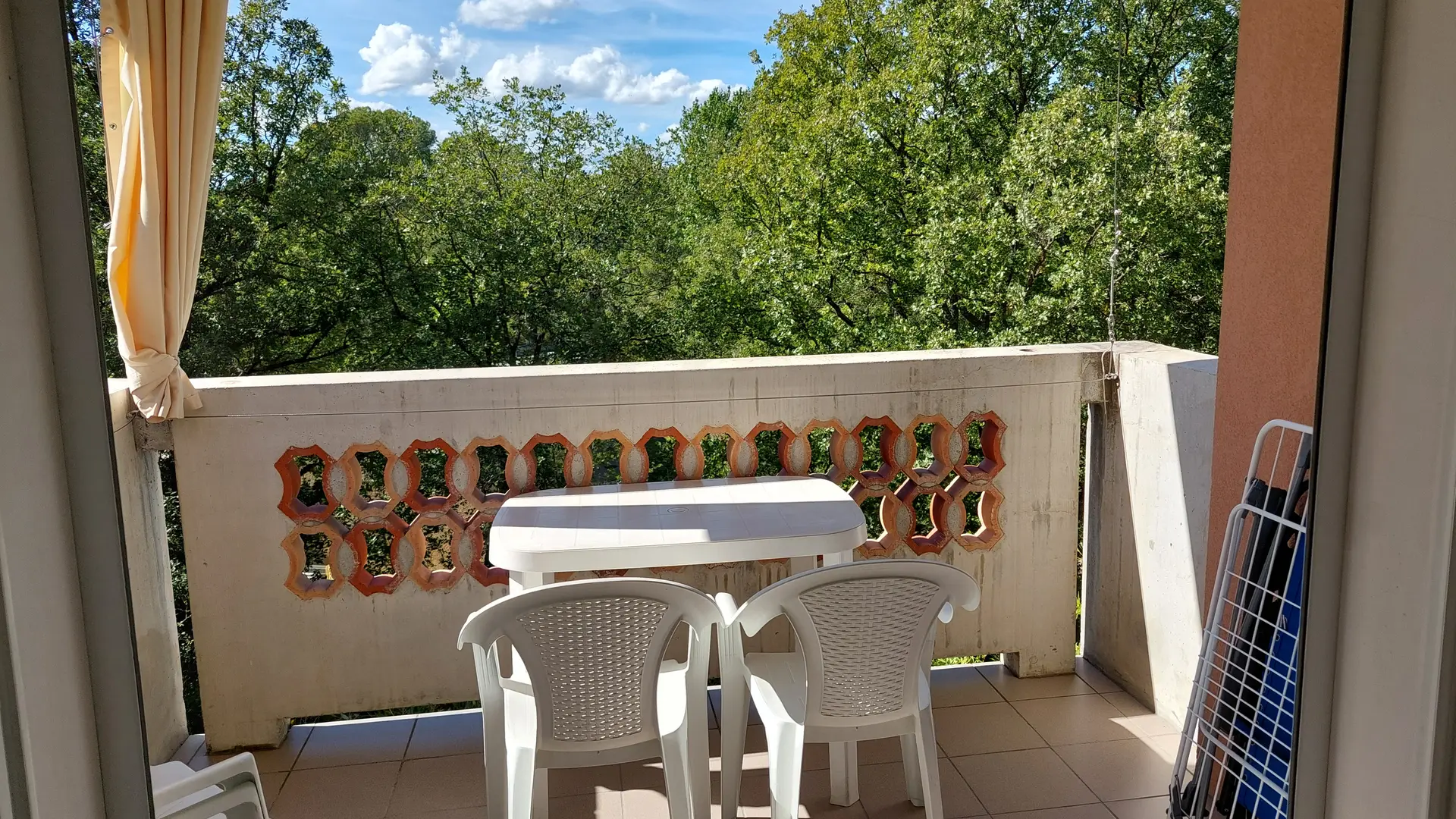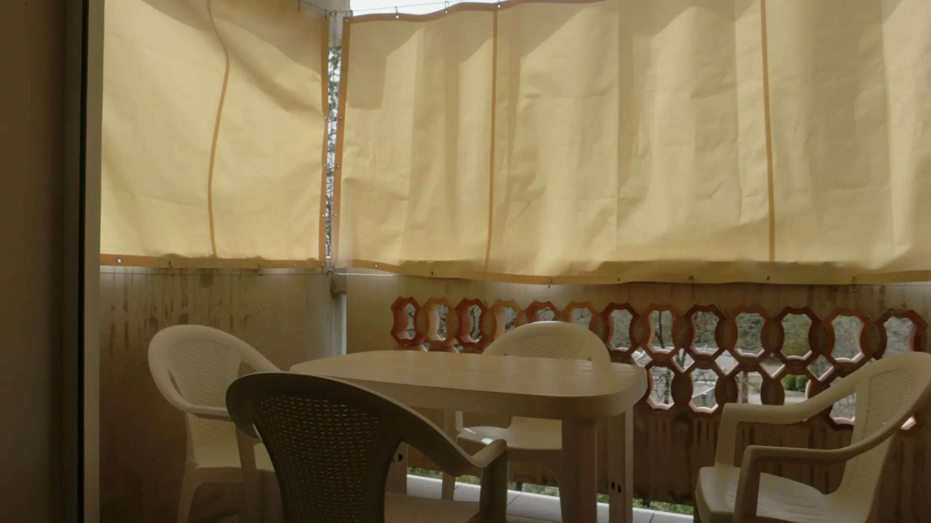 Le balcon est doté d’un fauteuil relax, d’une table et de chaises pour quatre personnes. Un rideau de protection du soleil et du vent permet au locataire de profiter au maximum de passer du temps à l’extérieur.