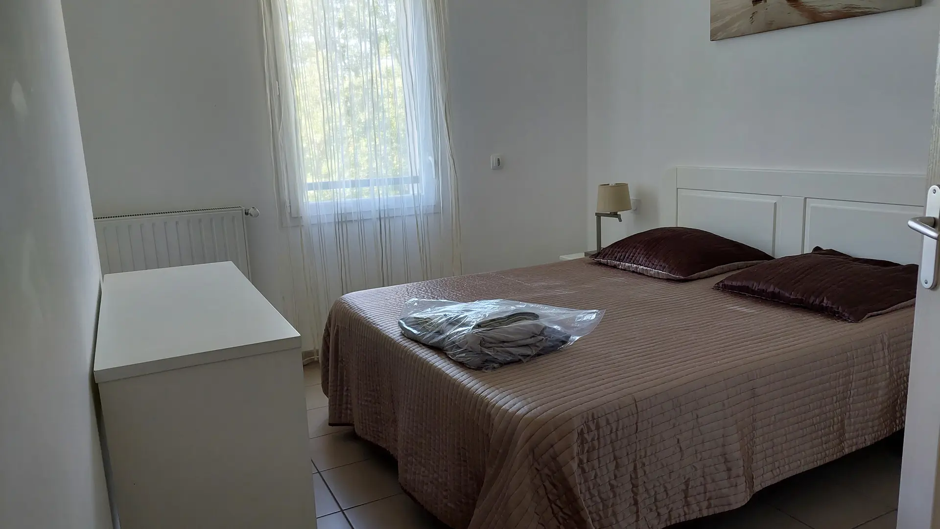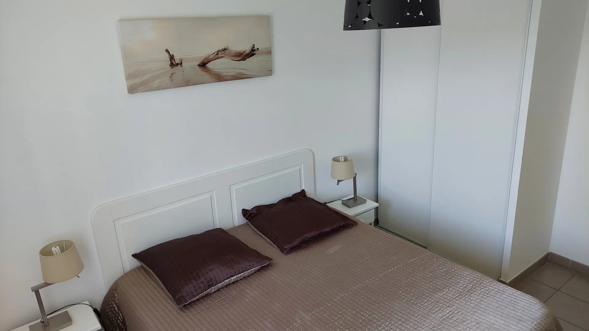 Vous disposez d’une chambre avec un lit double 160x200, une grande armoire avec une penderie, deux tables de chevet et une table qui peut servir comme bureau.