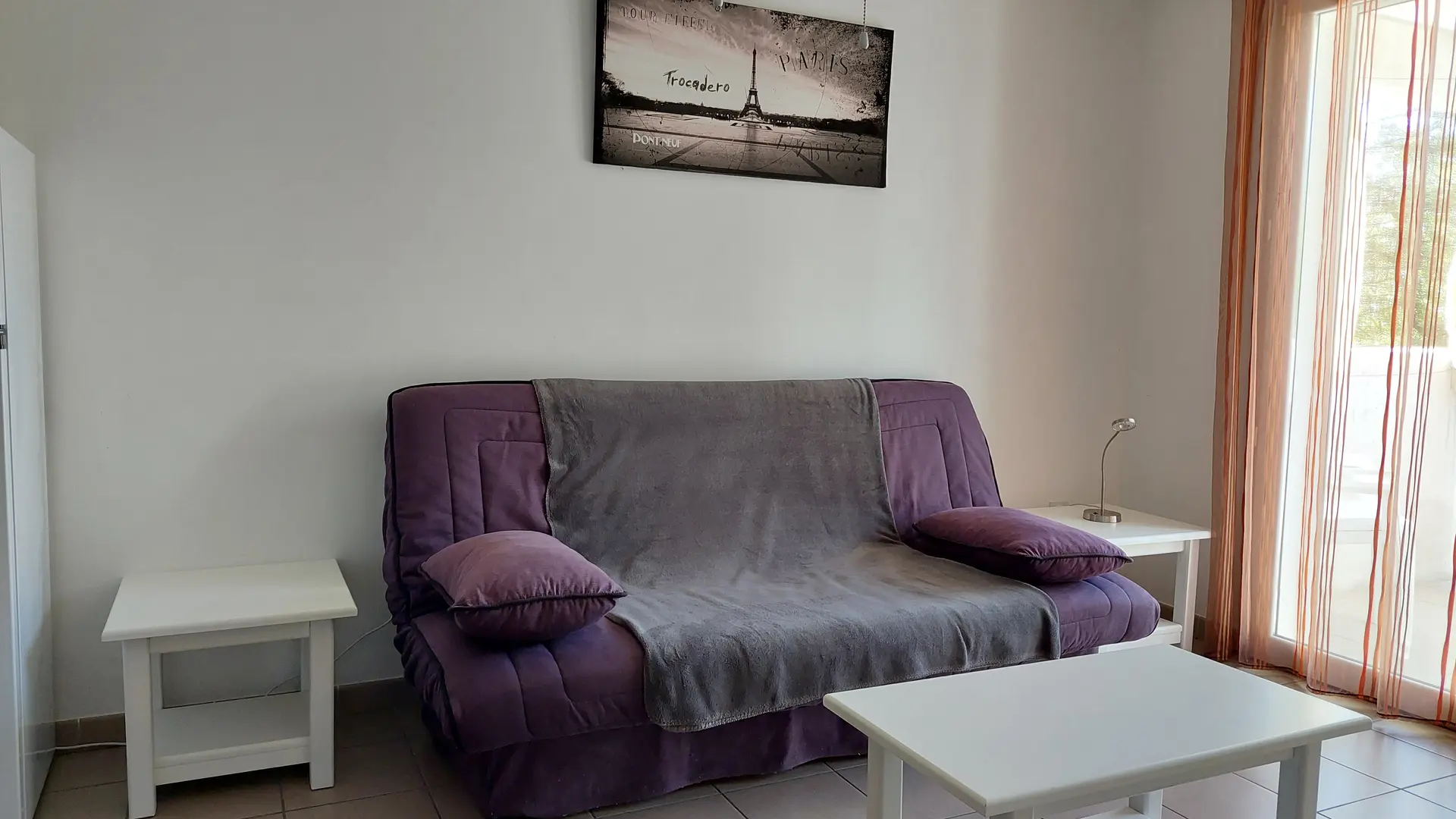 La résidence Lou San Peyre était construite en 2013 dans le style provençal. L’appartement (40,1 m2) englobe une pièce séjour/cuisine spacieuse (22,8m2), une grande chambre(11m2) et une salle de bains avec WC (6,3m2). Une double porte fenêtre dans la pièce séjour/cuisine donne accès au balcon. Le balcon (5,3m2) avec son orientation vers l’ouest donne place à quatre personnes.