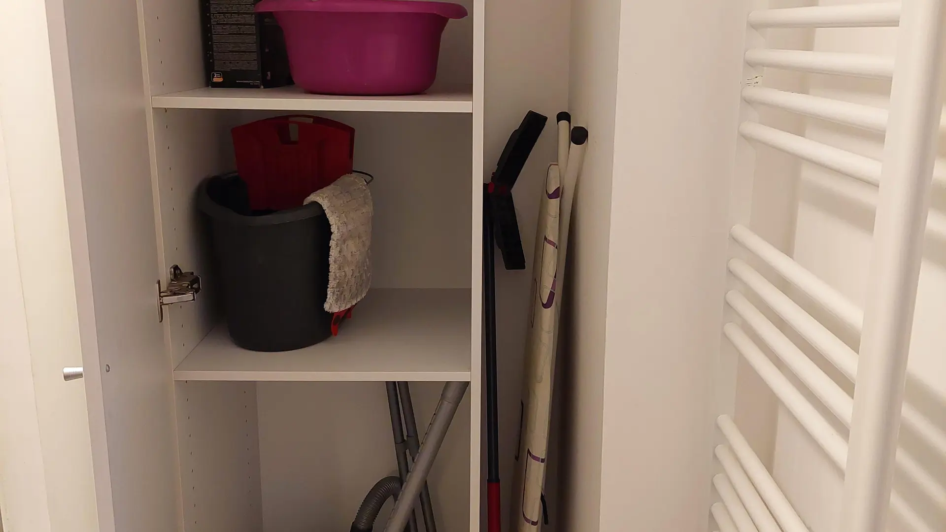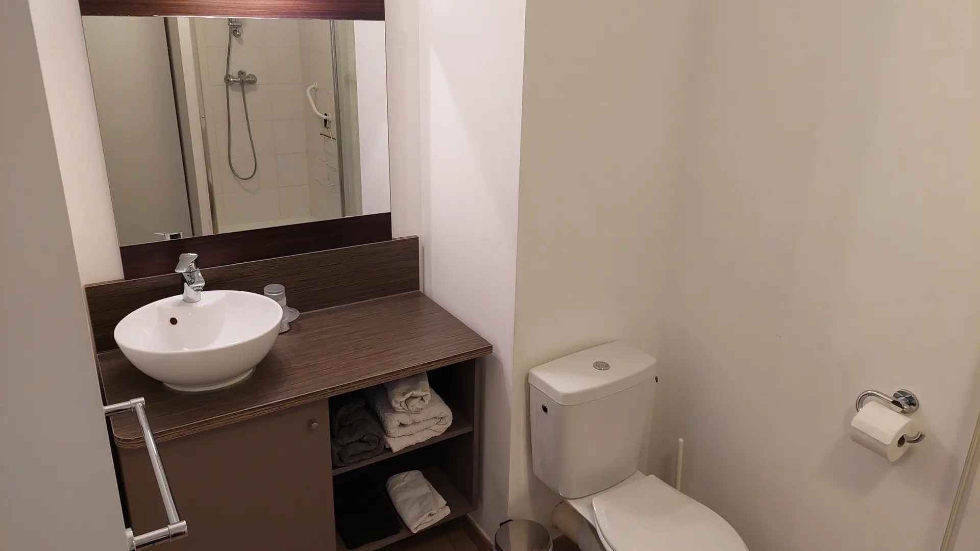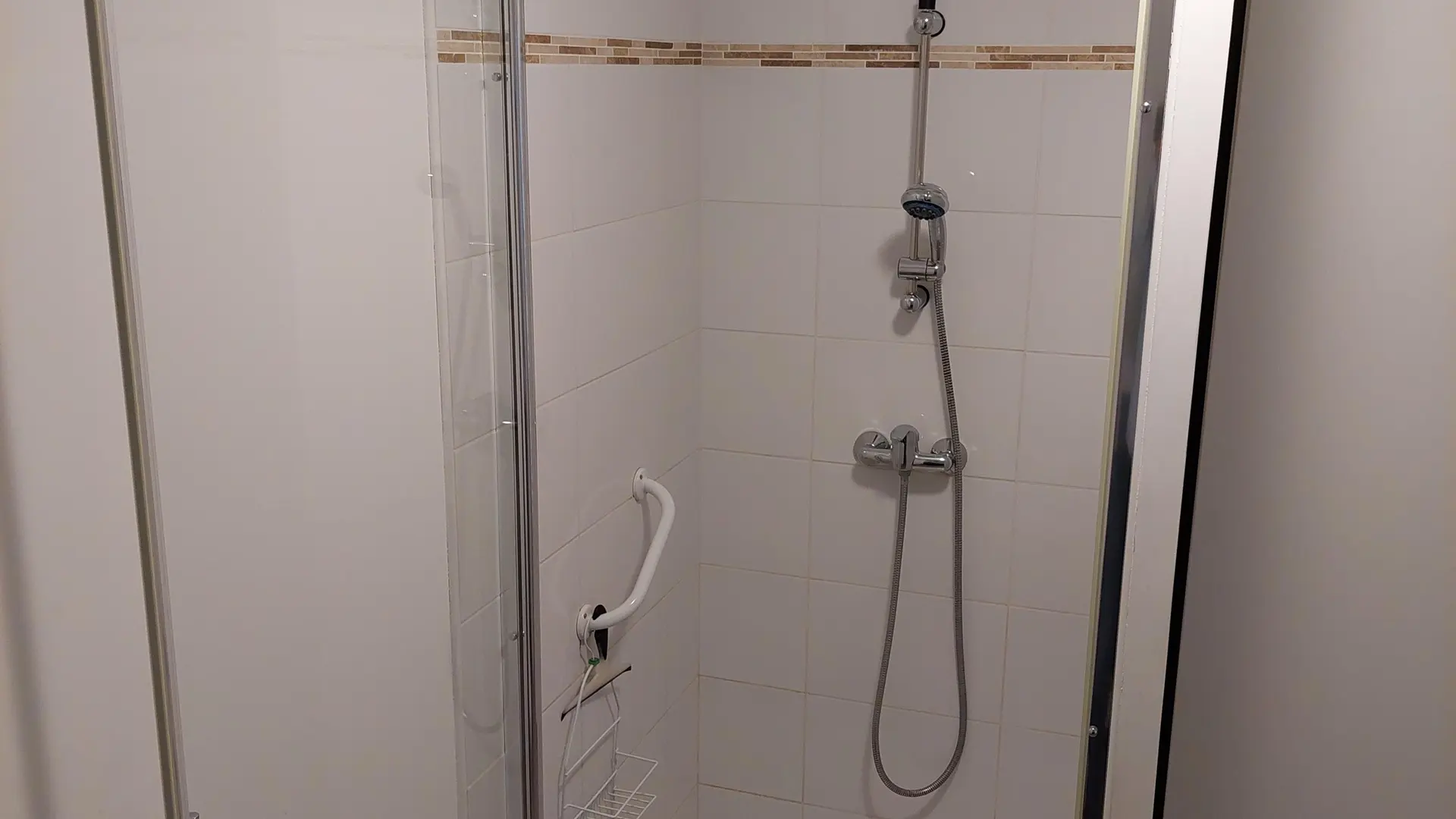 La salle de bains est pourvue d’une douche, d’un lavabo, d’un WC et d’un étendage à linge.