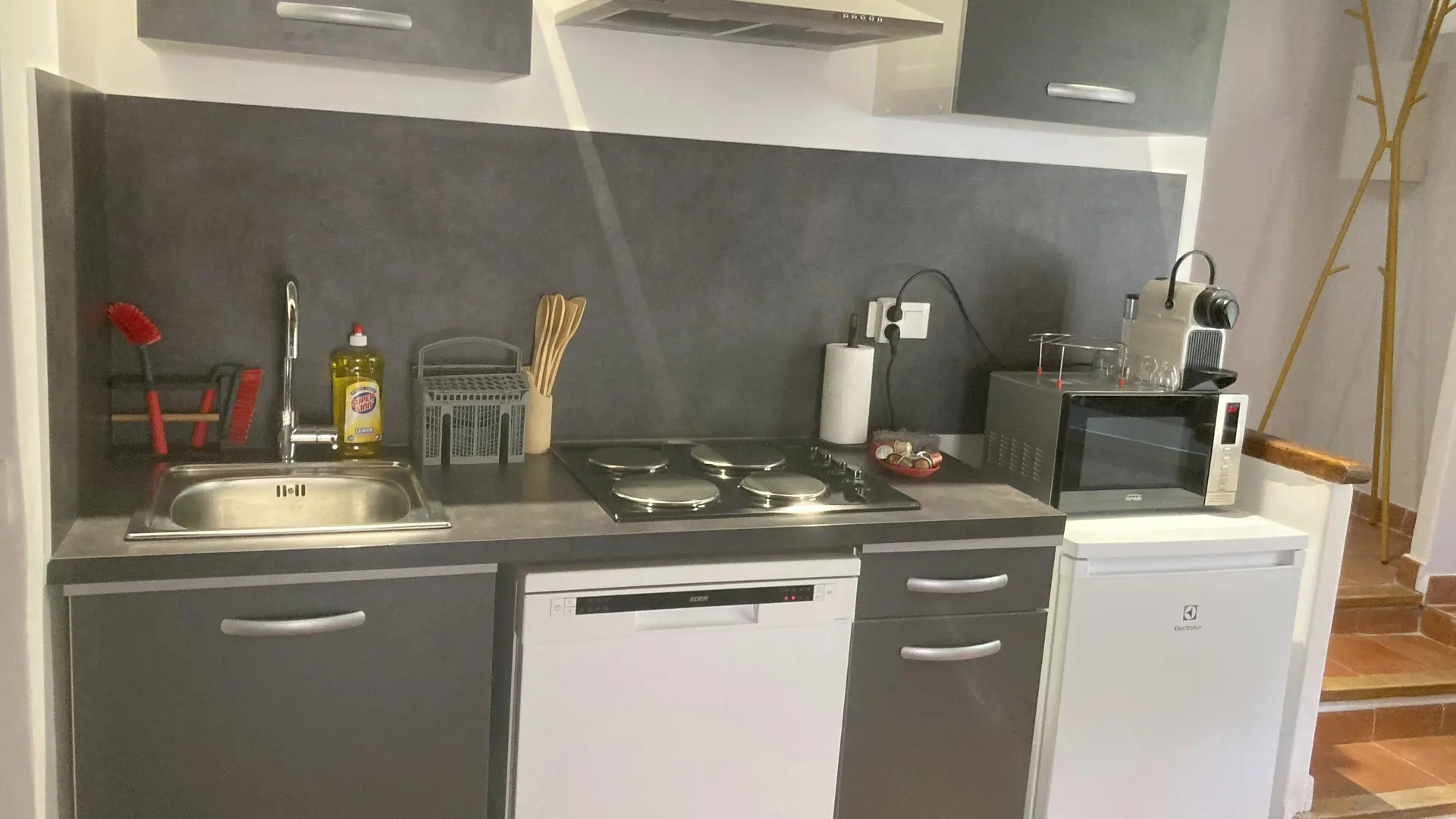 Au rez-de-chaussée, d'une cuisine, salon équipé d'un lave-vaisselle, d'un réfrigérateur, un four micro-onde, ect...