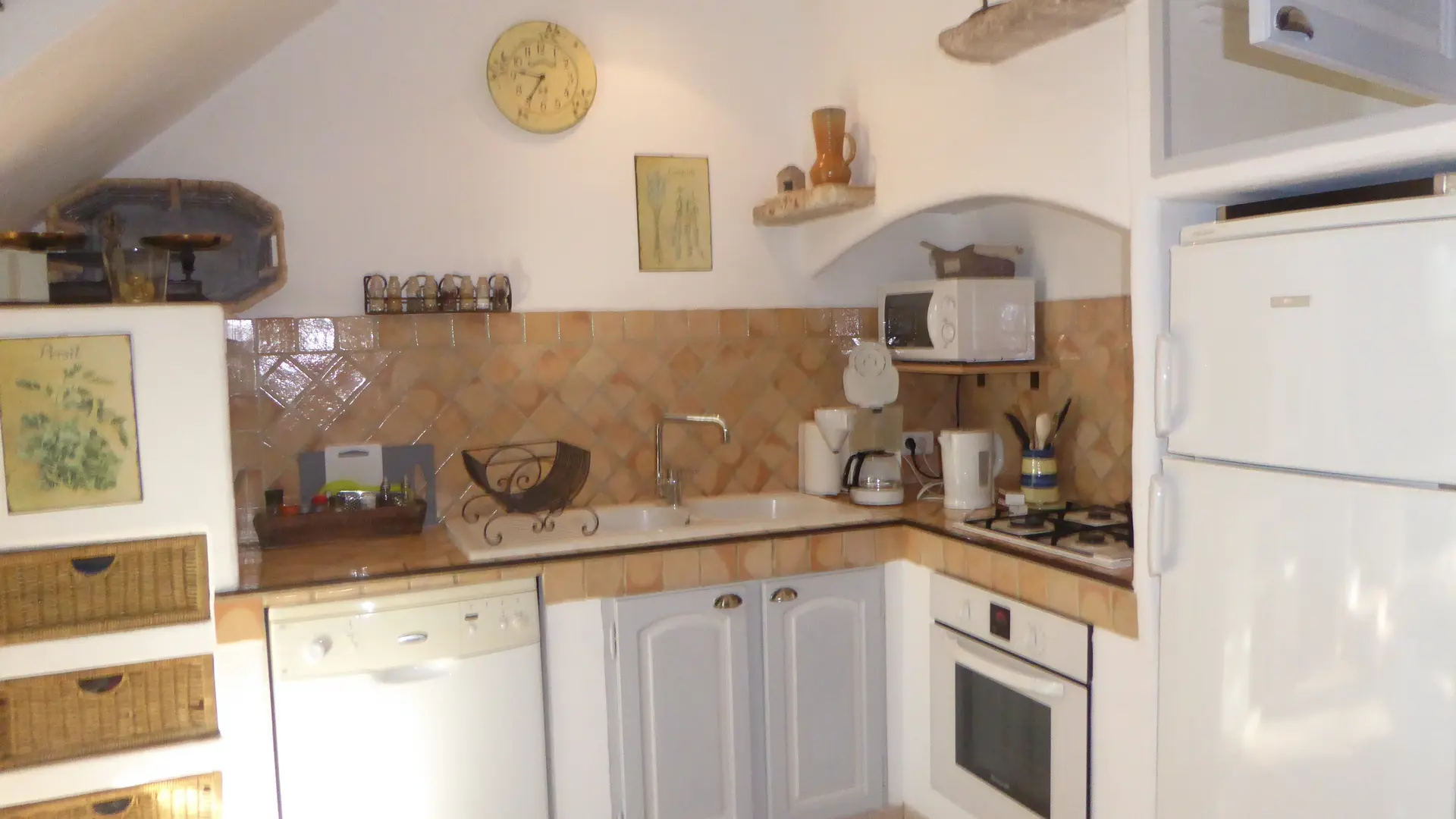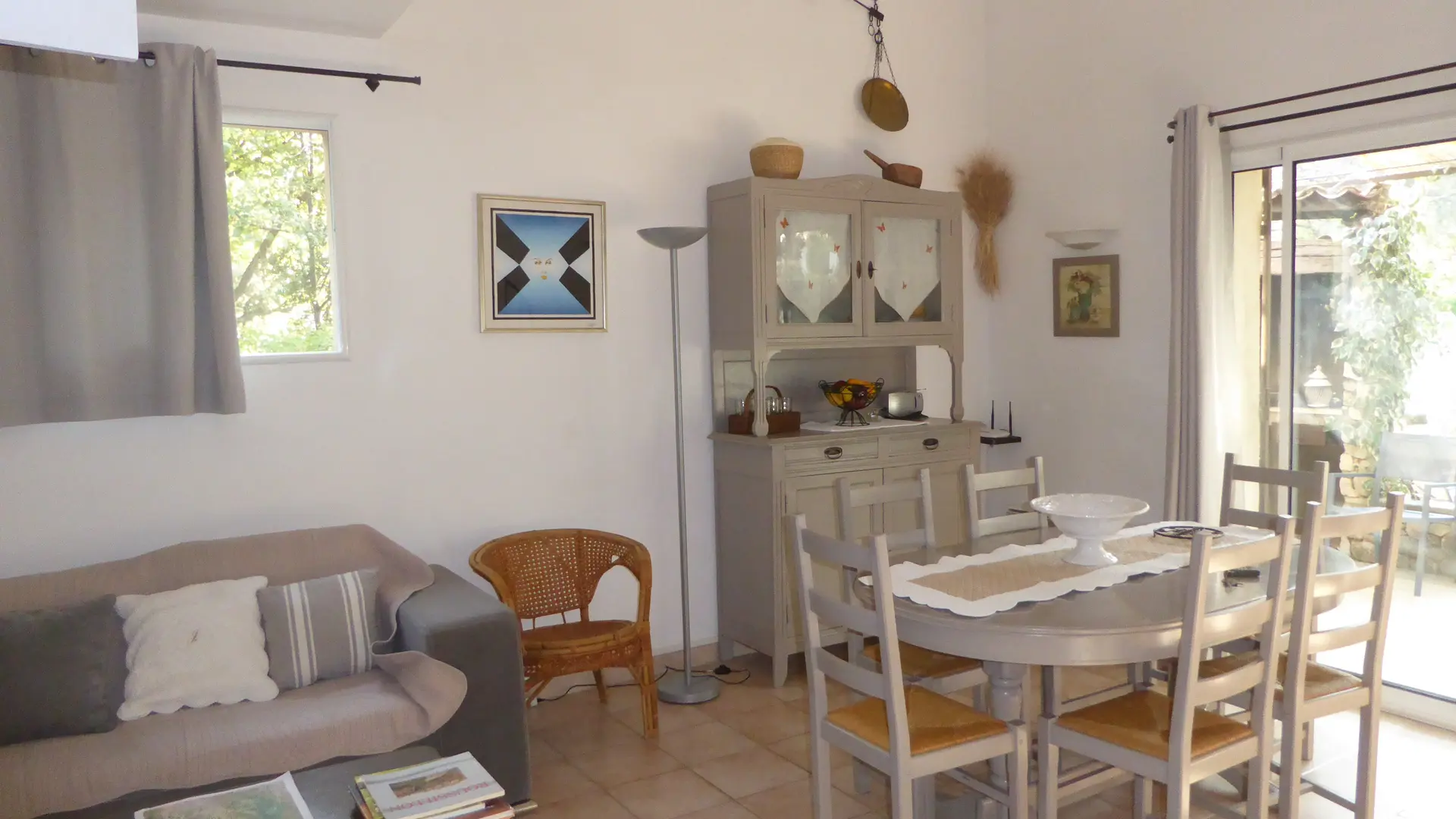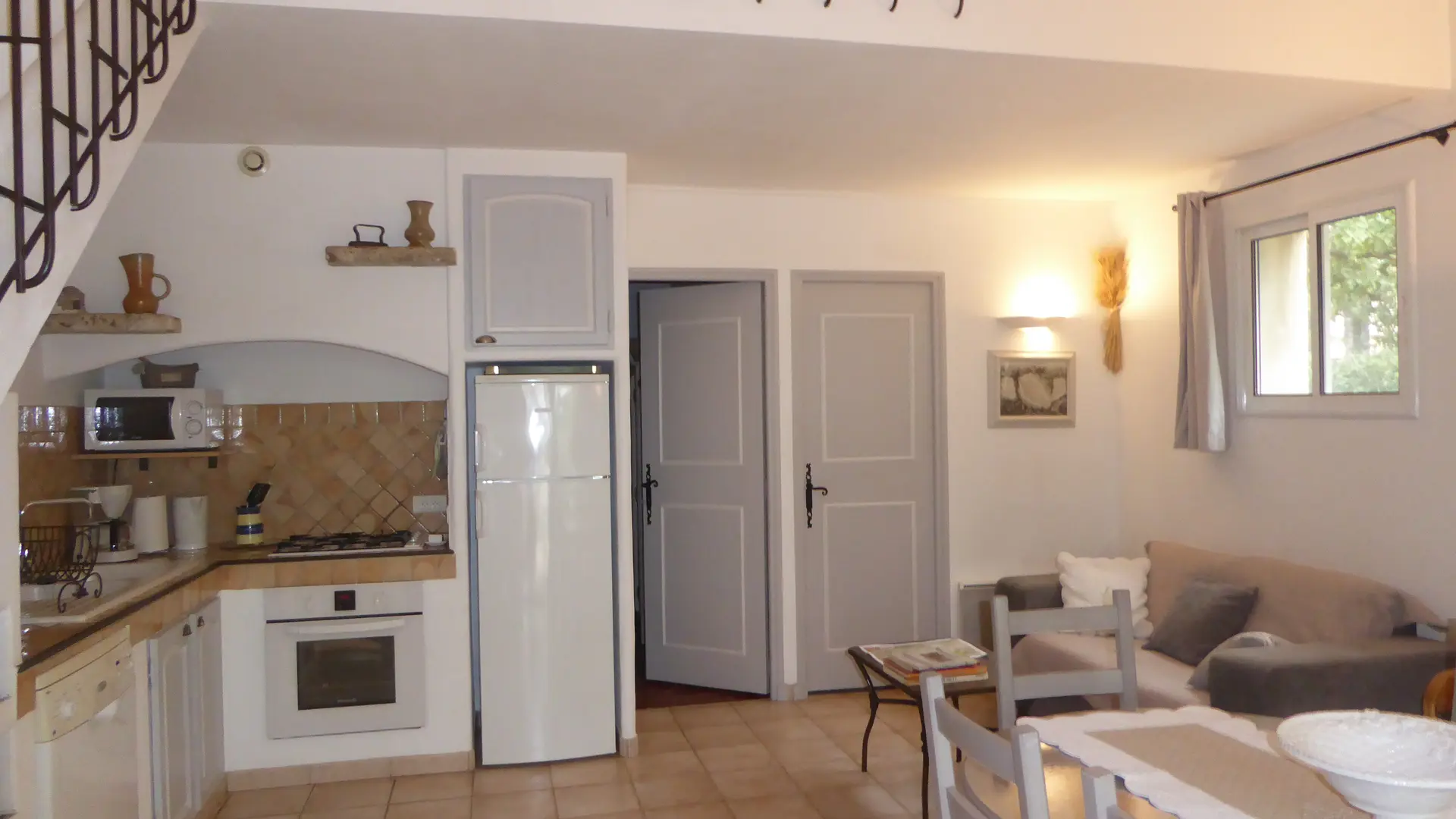 La maison, entièrement équipée: lave vaisselle, lave linge, frigo congélateur, plaque de cuisson, aspirateur, Senseo et cafetière, sèche cheveux, fer à repasser...peut accueillir 5 personnes. La pièce à vivre donne sur la terrasse et son barbecue.