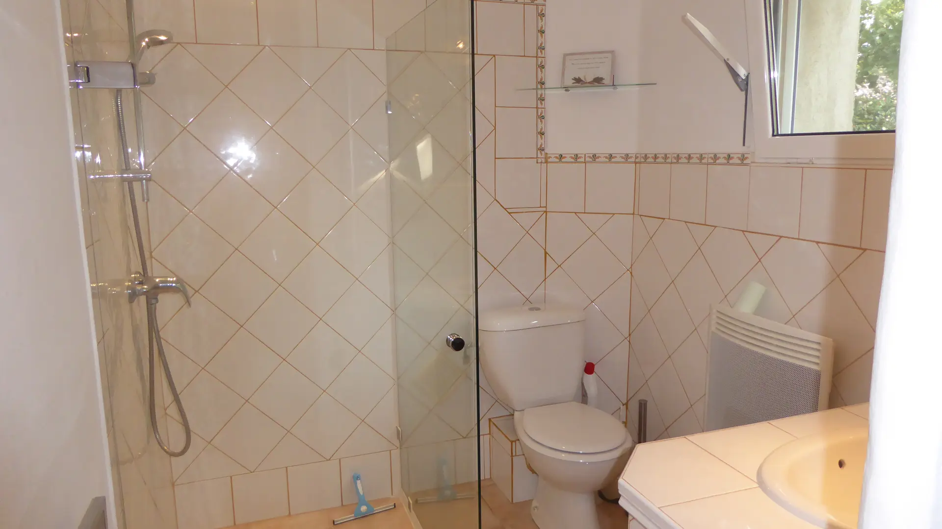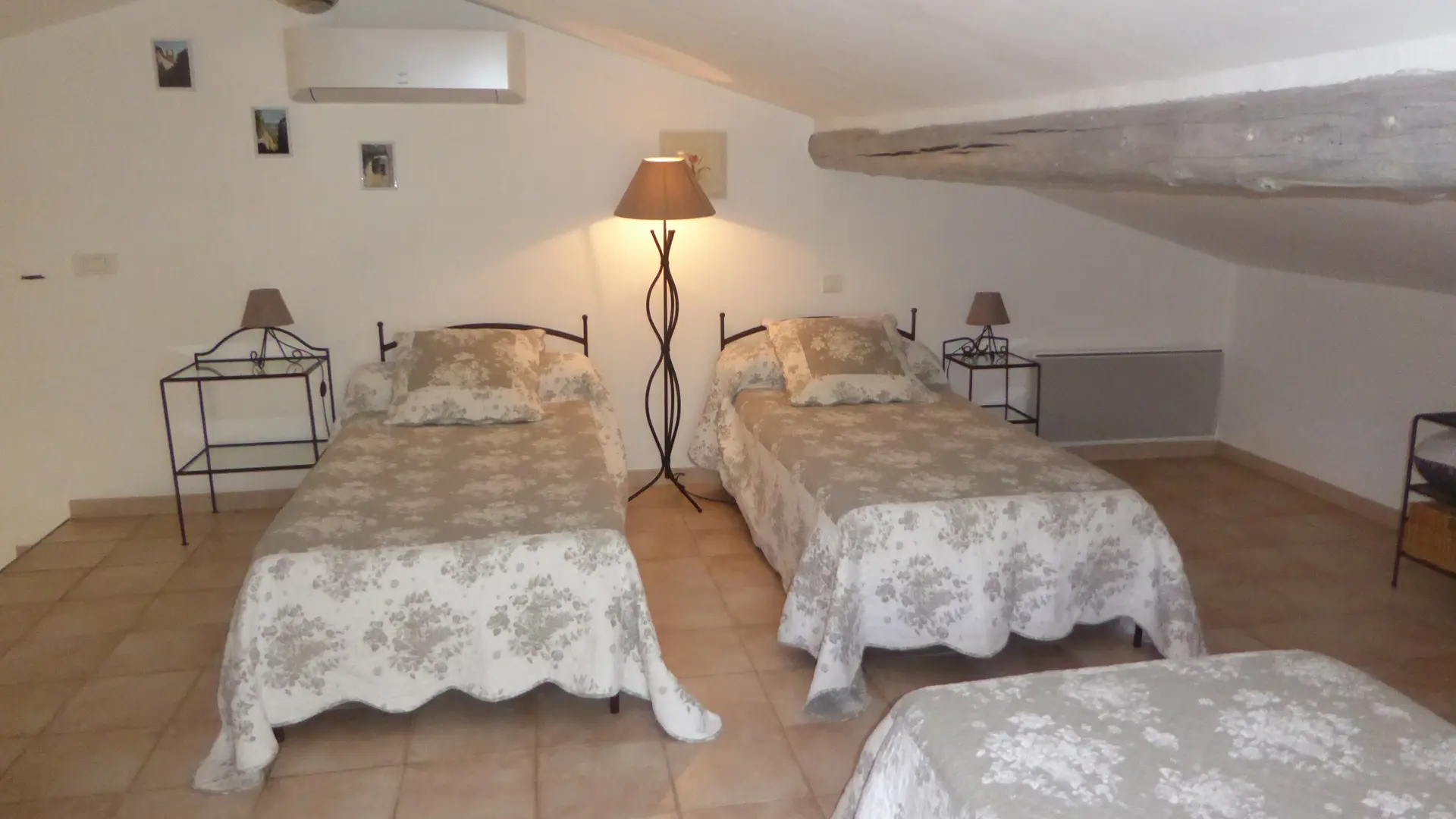 En rez-de-chaussée, une chambre et son lit en 160cm. Une salle de douche à l'italienne et toilettes. En mezzanine, 3lits en 90cm, un cabinet de toilettes et lavabo.