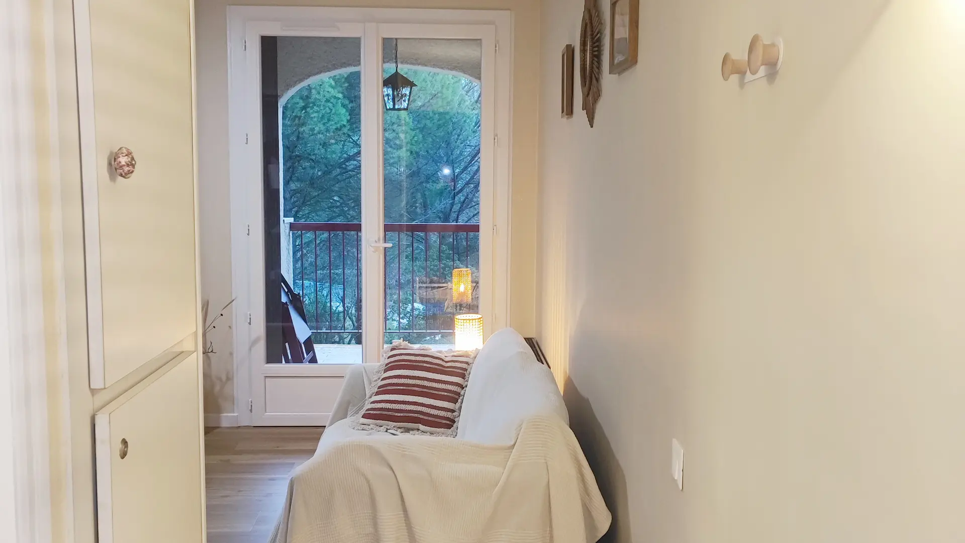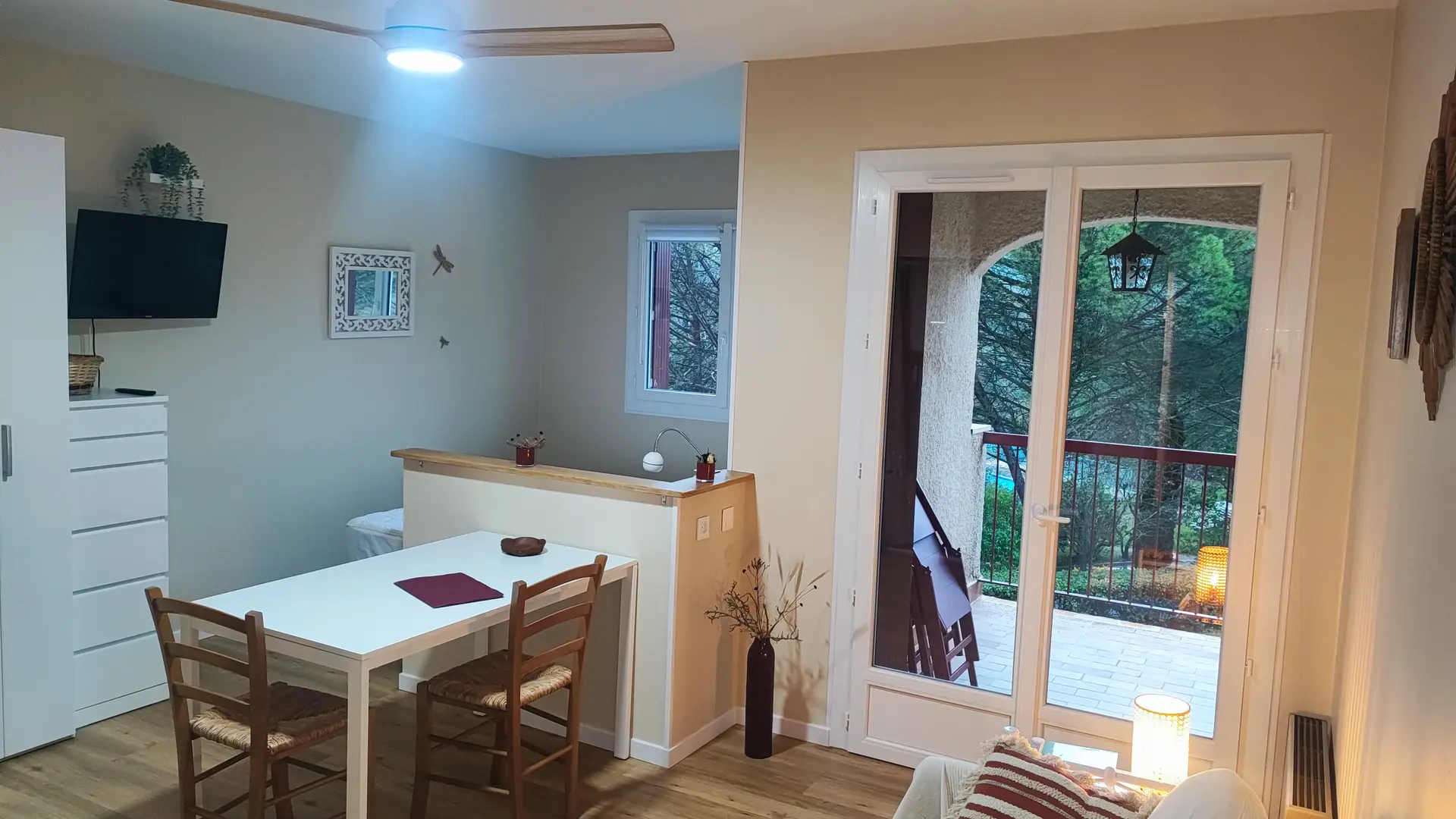 Studio avec coin nuit, et belle terrasse donnant sur la pinède Sud. Rénové en 2025. Cuisine séparée, ventilateur plafonnier, moustiquaire, douche italienne. Au 1er étage avec ascenseur. À 9min à pieds des thermes. Place de parking privée. Boîte à clés.