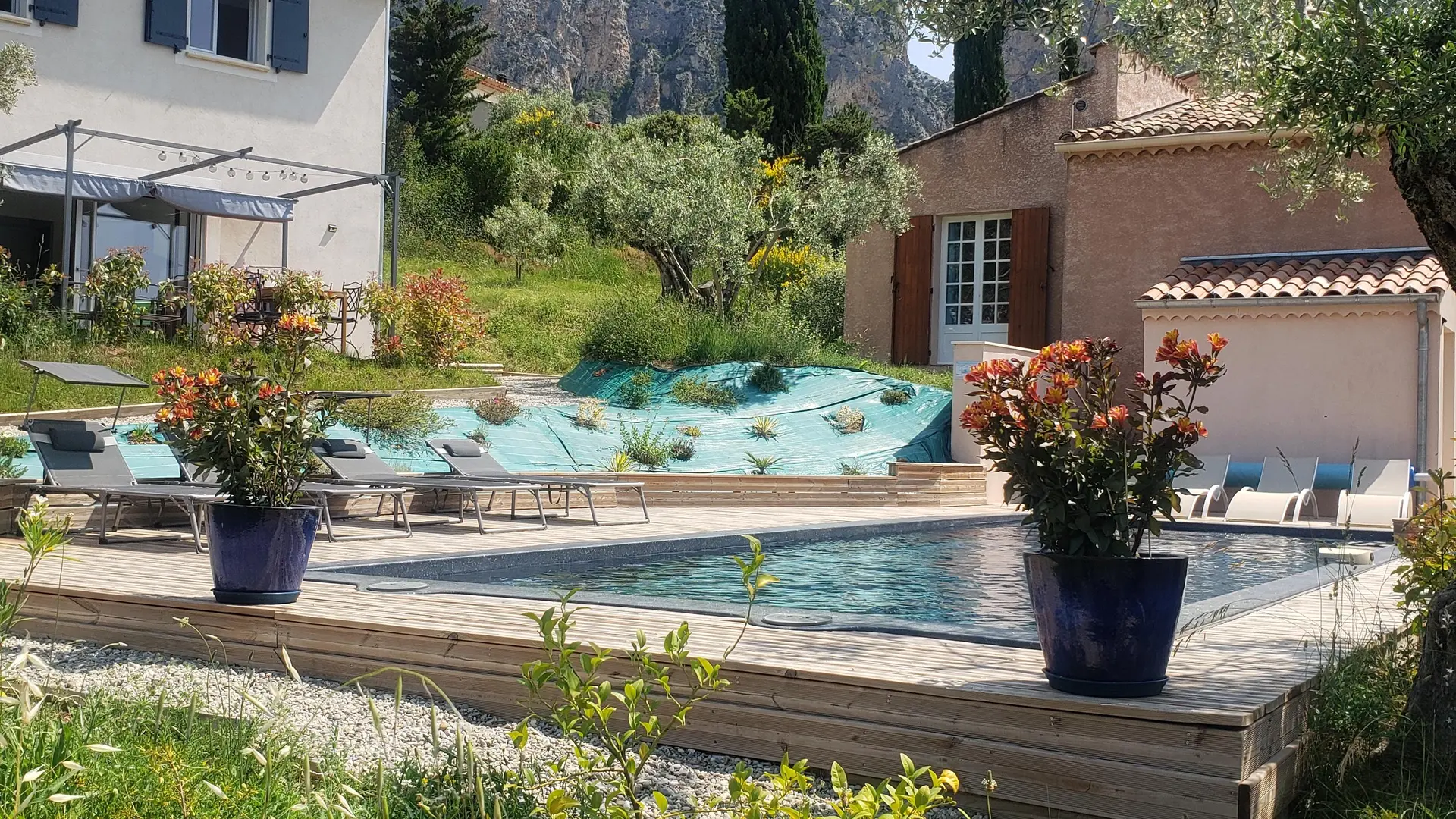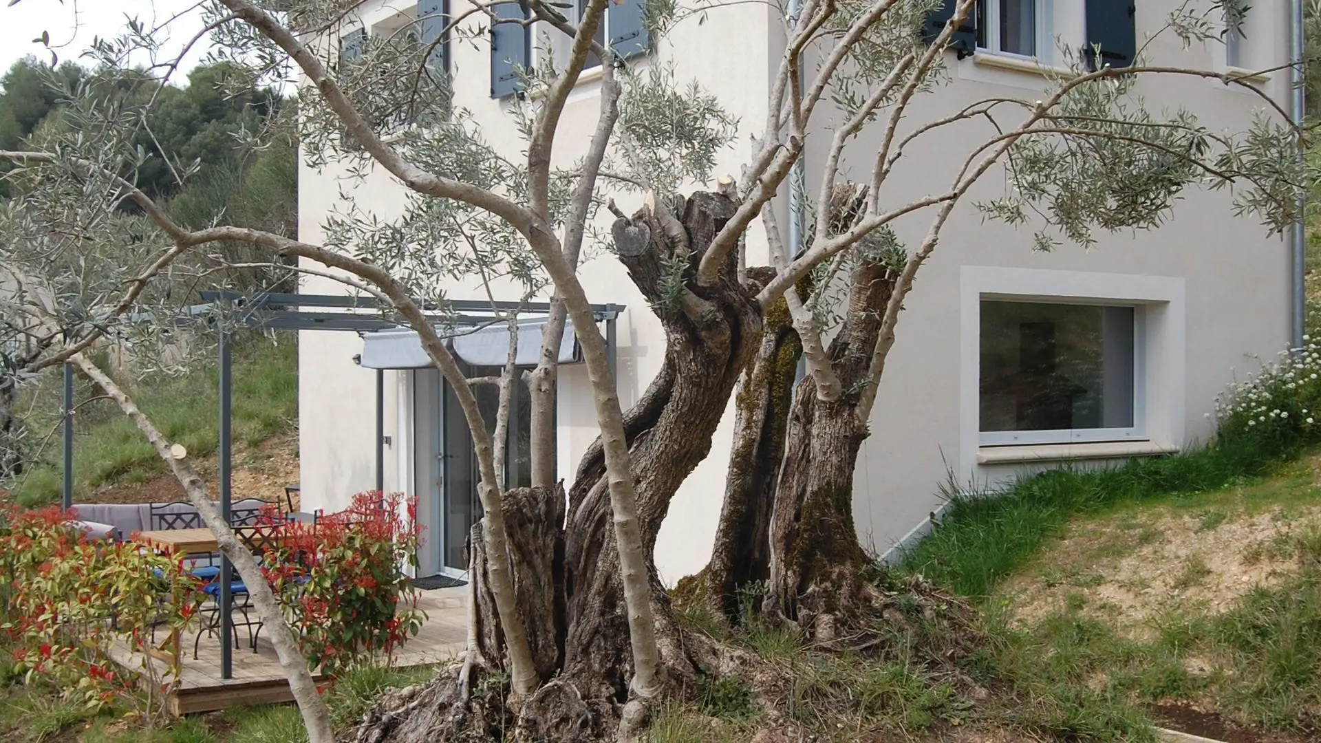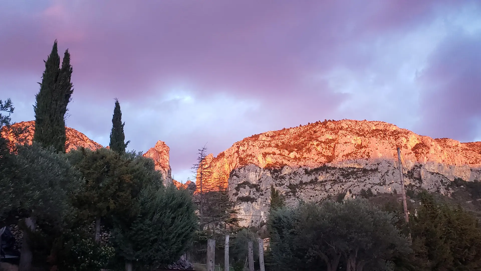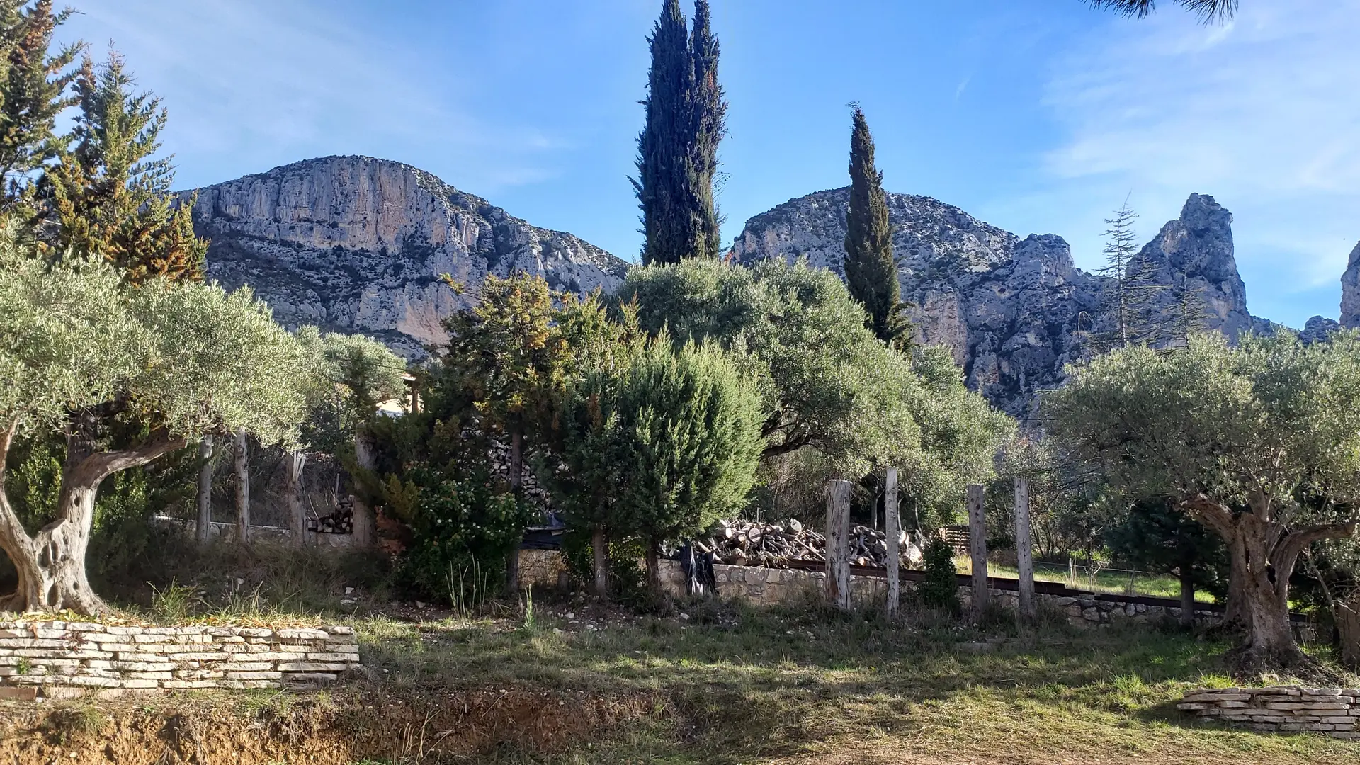 Au pied du village, sur un domaine de 2670 m2 bordé d’oliviers, maison indépendante avec vue exceptionnelle sur l’étoile et le piton rocheux de Moustiers Sainte Marie.