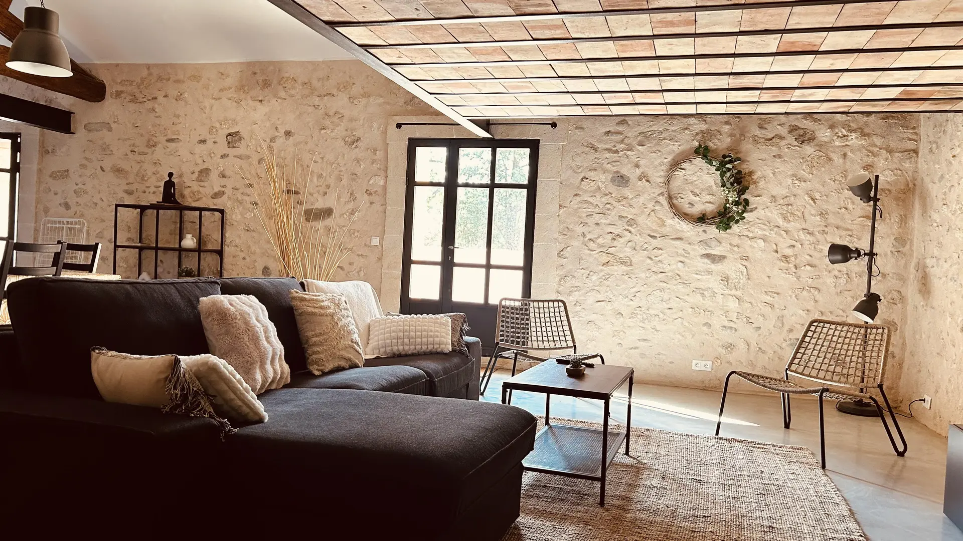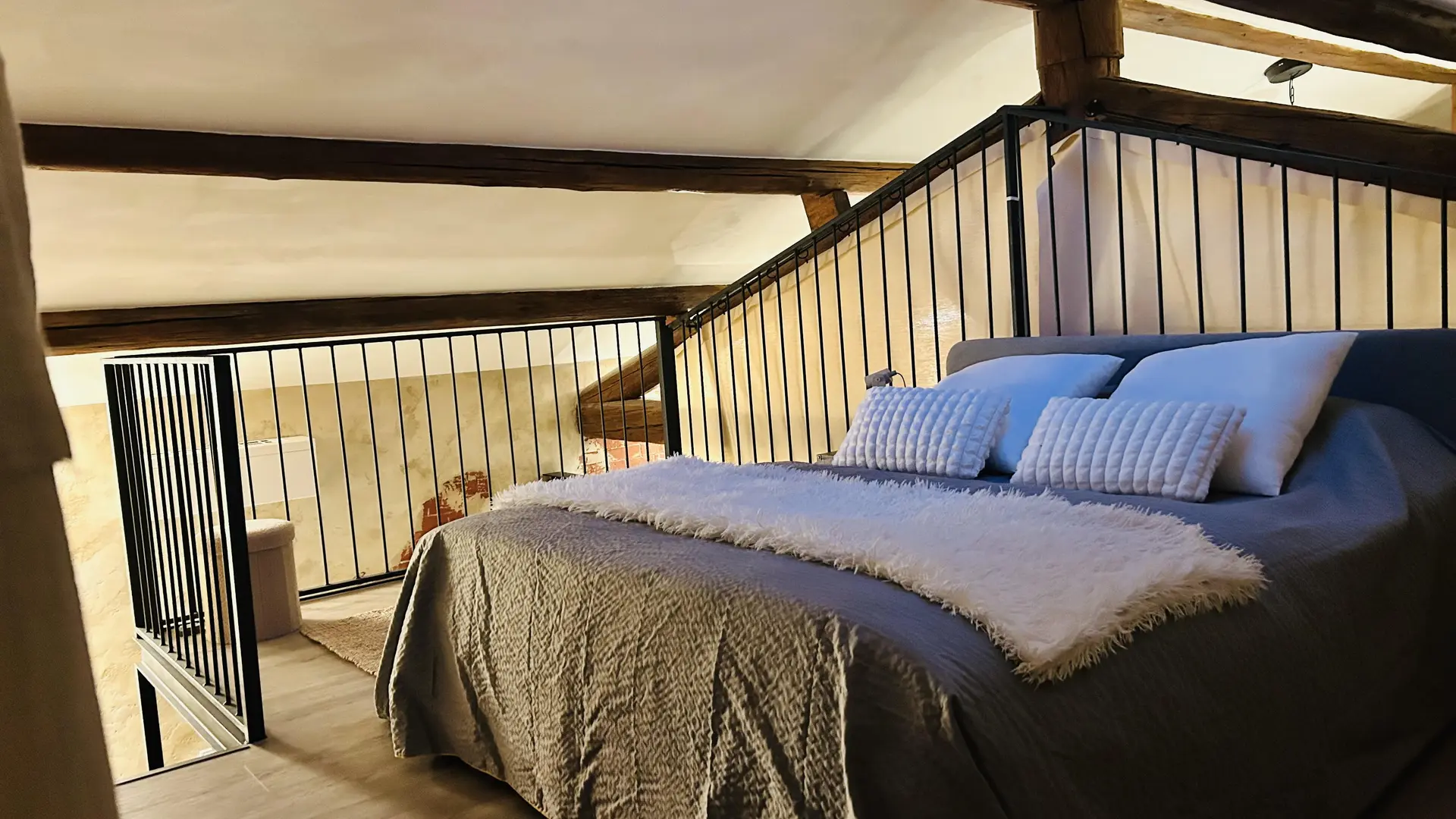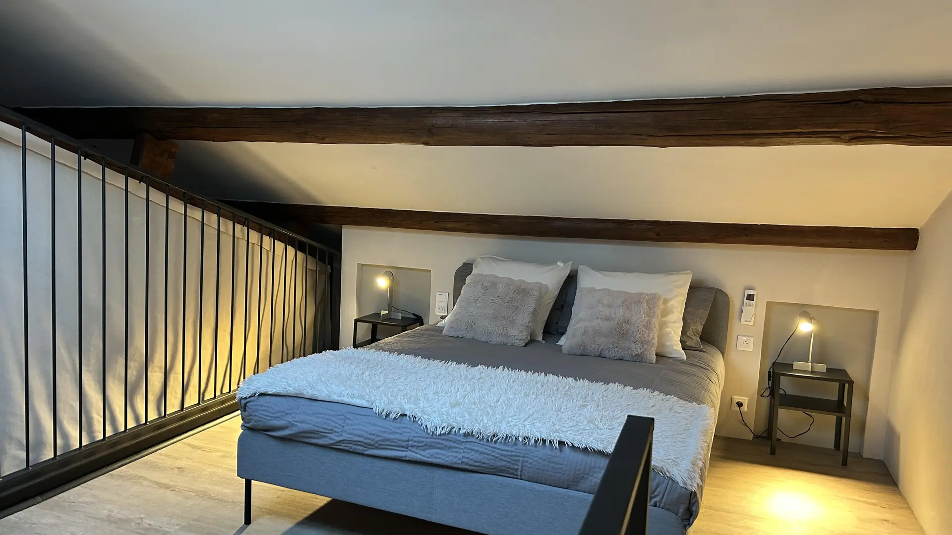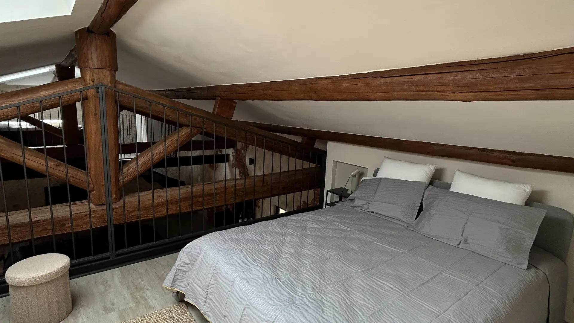 Loft au charme authentique, mêlant poutres apparentes, murs en pierre et esprit industriel contemporain. Deux chambres mansardées, accessibles par un escalier de chaque côté semblent suspendues au-dessus de l'espace de vie. Terrasse privée, piscine, clim.