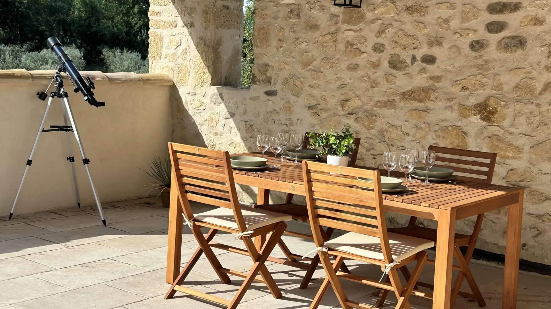 Depuis sa terrasse panoramique, la vue ouvre une parenthèse paisible sur la campagne, un cadre idéal pour contempler les étoiles grâce au télescope que nous mettons à votre disposition.