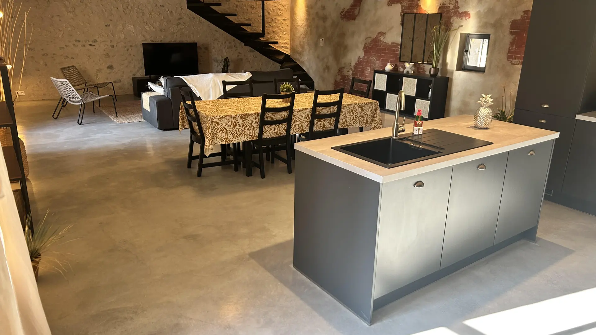 Avec ses lignes épurées, ses matériaux bruts, ce loft singulier marie harmonieusement style industriel et confort haute de gamme. Niché au sommet d’un magnifique escalier de pierres anciennes, il séduit par son agencement et ses volumes généreux qui profite d'une lumière naturelle.