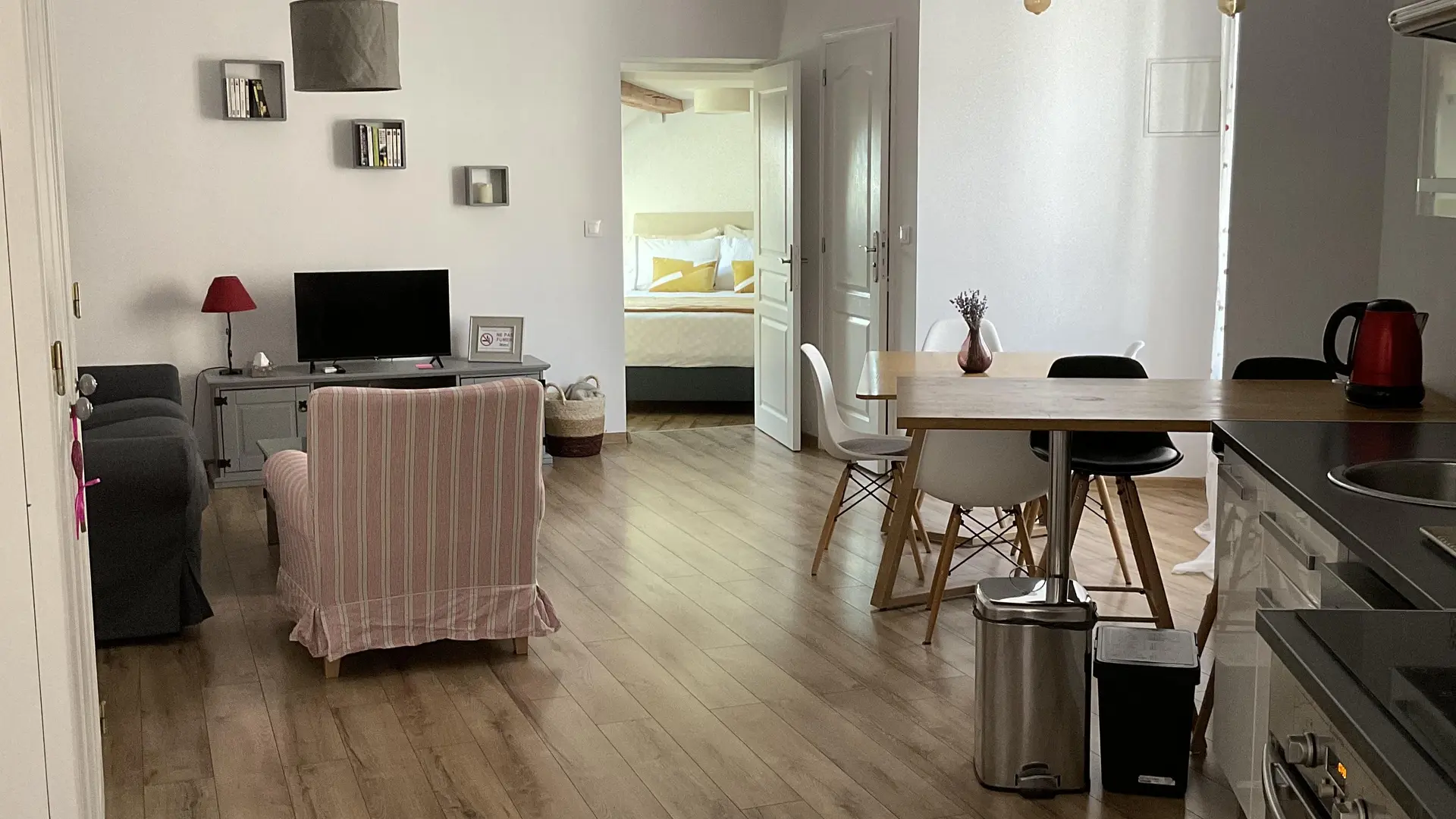 - d'une grande pièce à vivre avec un canapé lit et une cuisine ouverte,