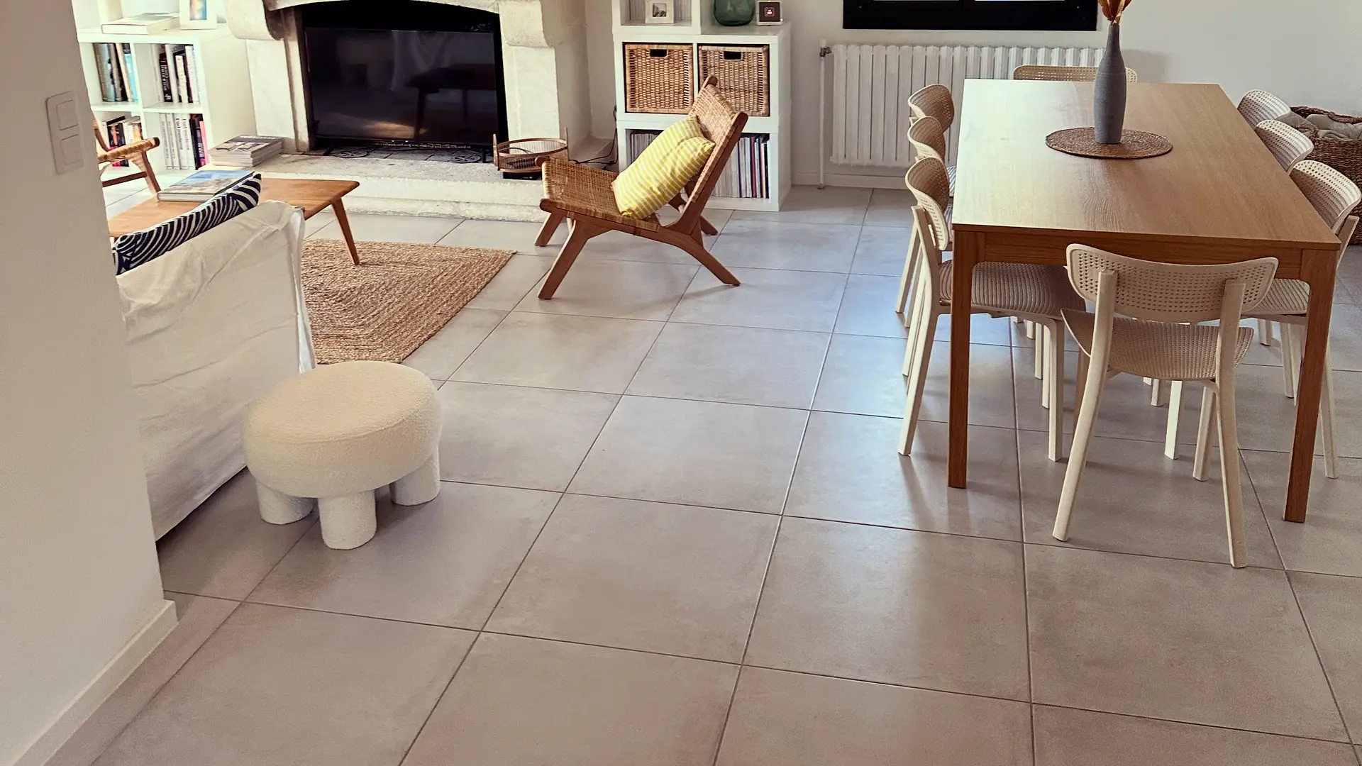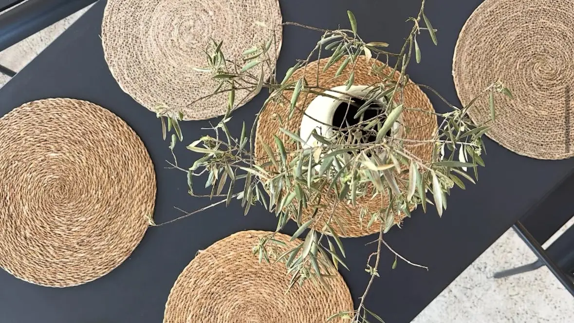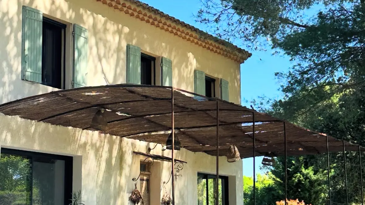 La maison s’ouvre sur une majestueuse terrasse de 120 m² orientée plein sud, offrant une triple exposition qui capture la lumière provençale du lever au coucher du soleil. Des canisses filtrent les rayons aux heures chaudes.