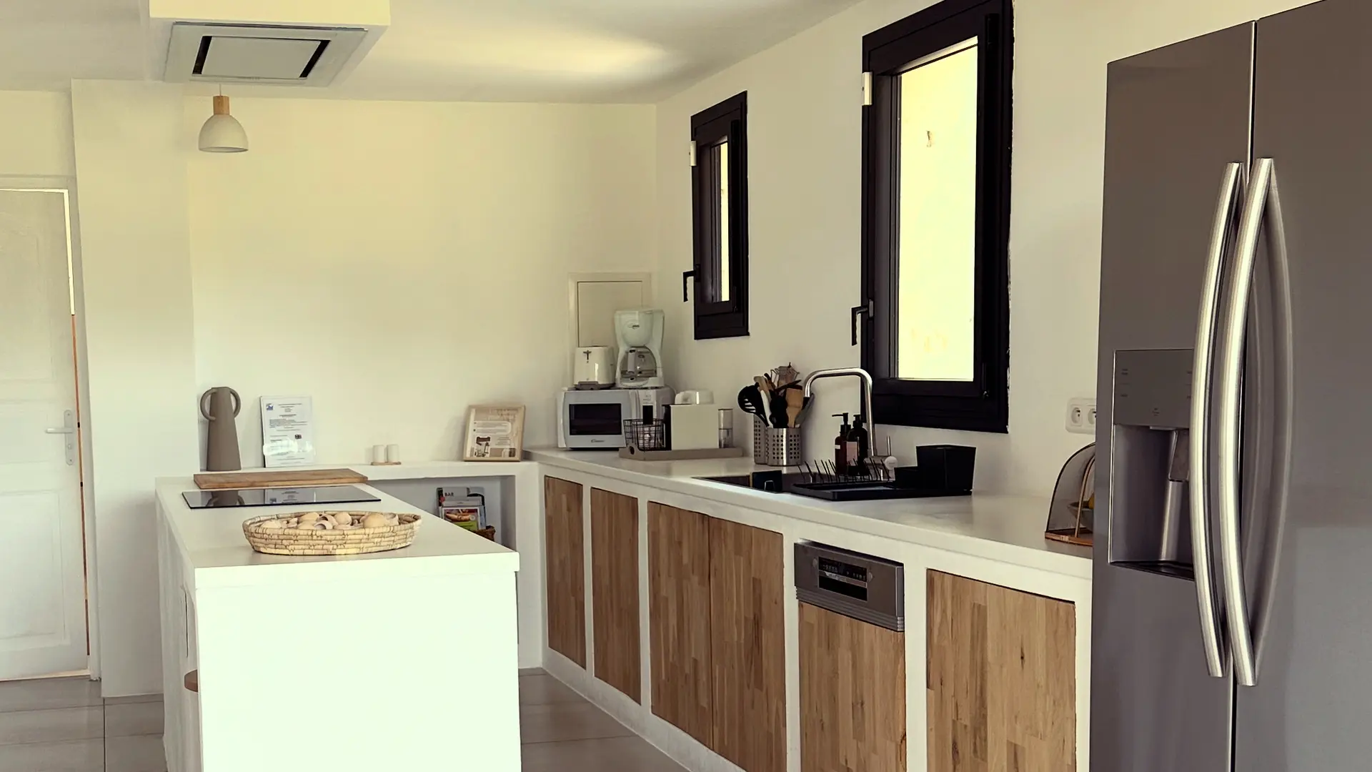 Une belle cuisine entièrement équipée avec frigo américain, plaques induction, four, micro-ondes, toaster, bouilloire, machine à café Nespresso, cafetière à filtre, lave-vaisselle, hotte appareil à raclette,