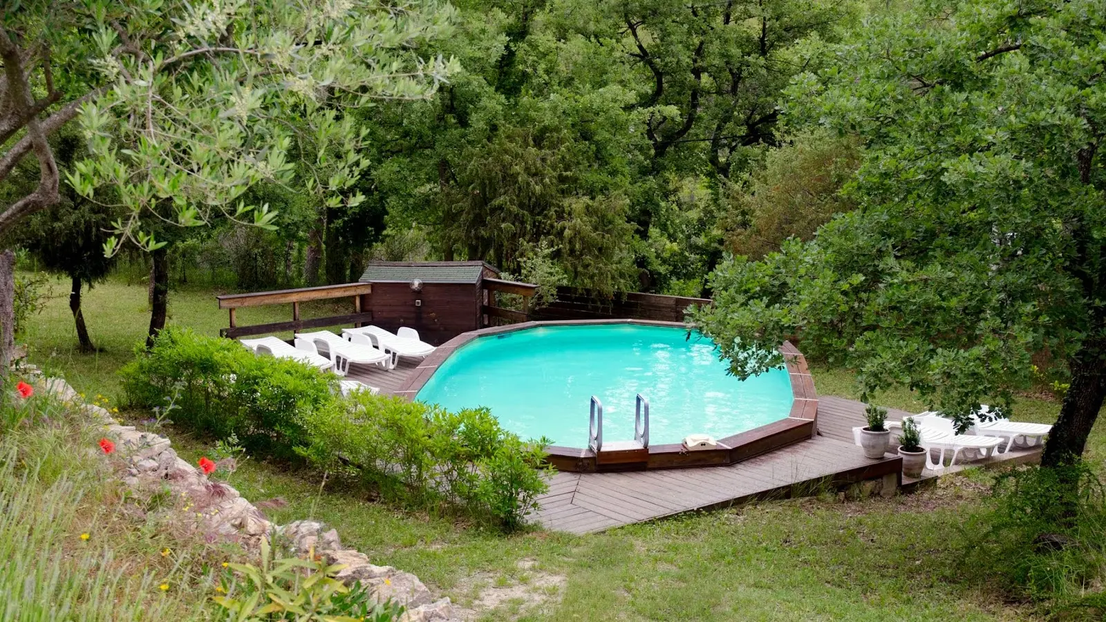 Cuisine d'été (barbecue, feu gaz, four à pain) avec terrasse de 30m² couverte et reliant la maison principale à l'annexe. Piscine (8x4x1.20) plage bois, alarme, située en contrebas de la berge devant maison. Local extérieur avec douche, lavabo et lave-linge.