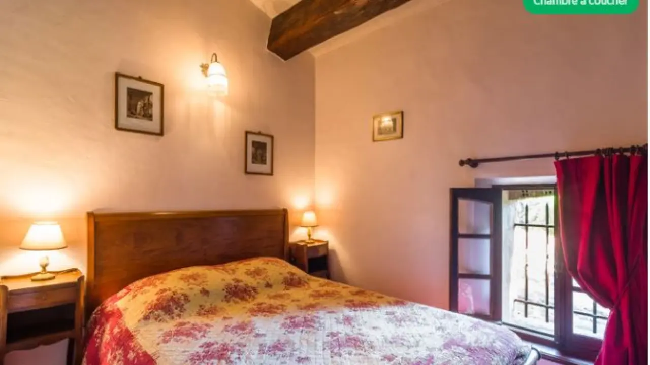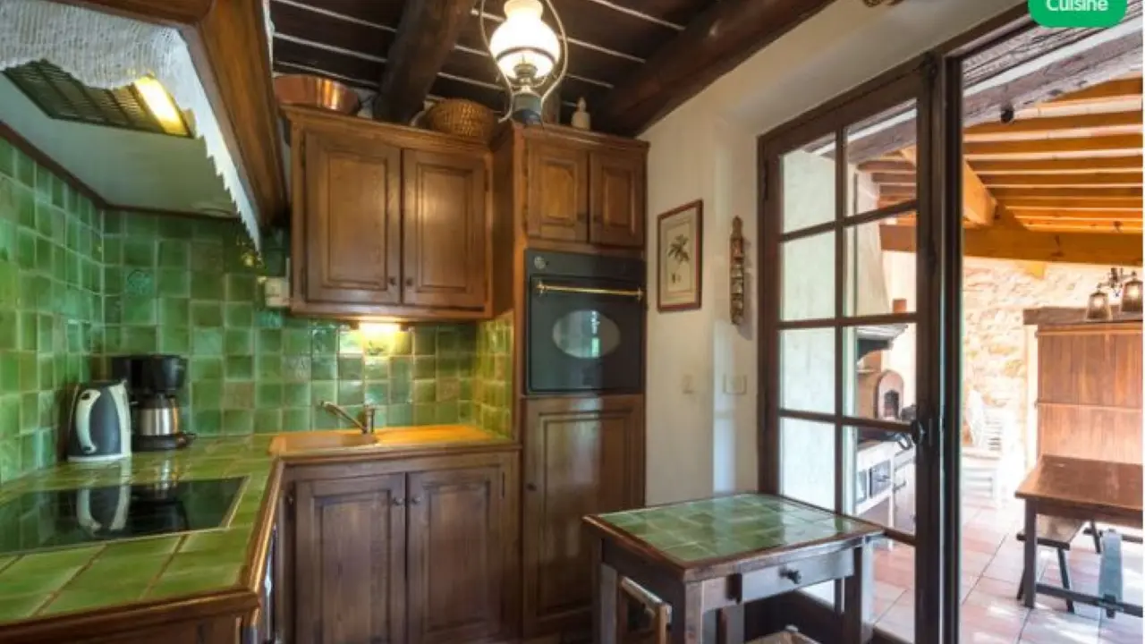 Annexe (22m²) avec climatisation : cuisine avec coin repas, TV et cheminée, 1 chambre 1 lit 2 pers, salle d'eau, WC. Chauffage électrique. Bois non fourni. Climatisation réversible.