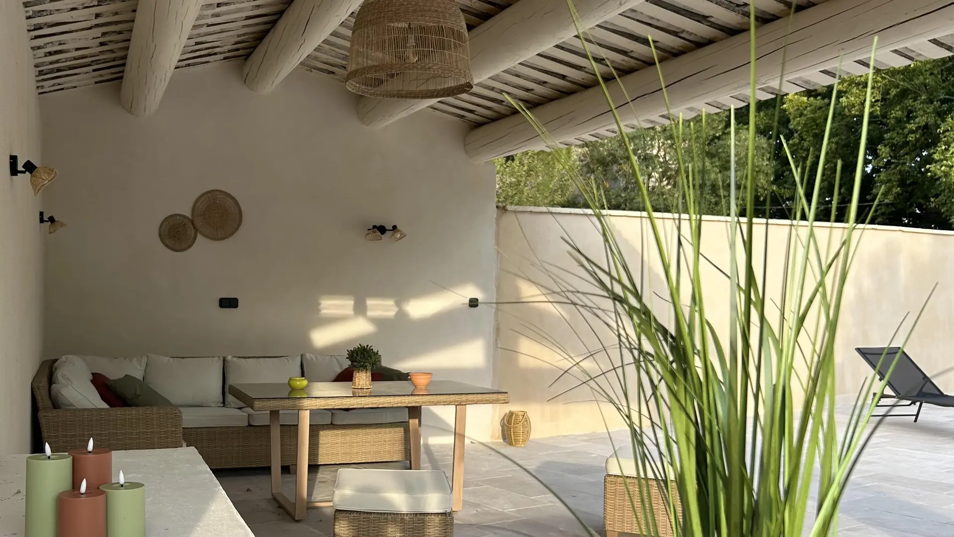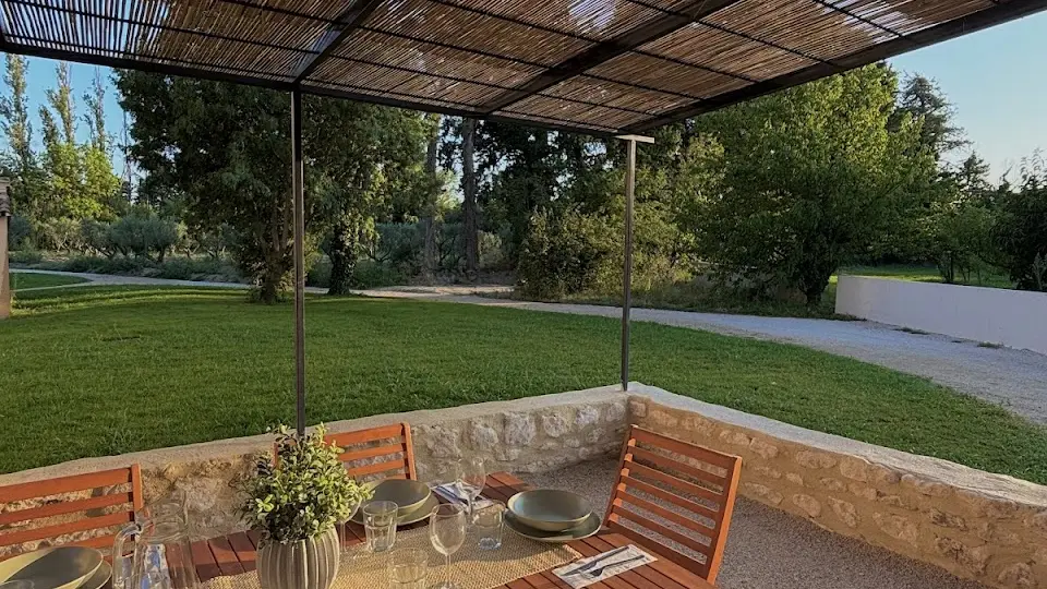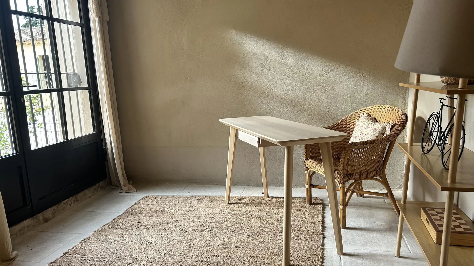 À l’extérieur, une terrasse privée, un espace repas ombragé et l’accès à la piscine du domaine invitent à la détente sous le soleil du Luberon.