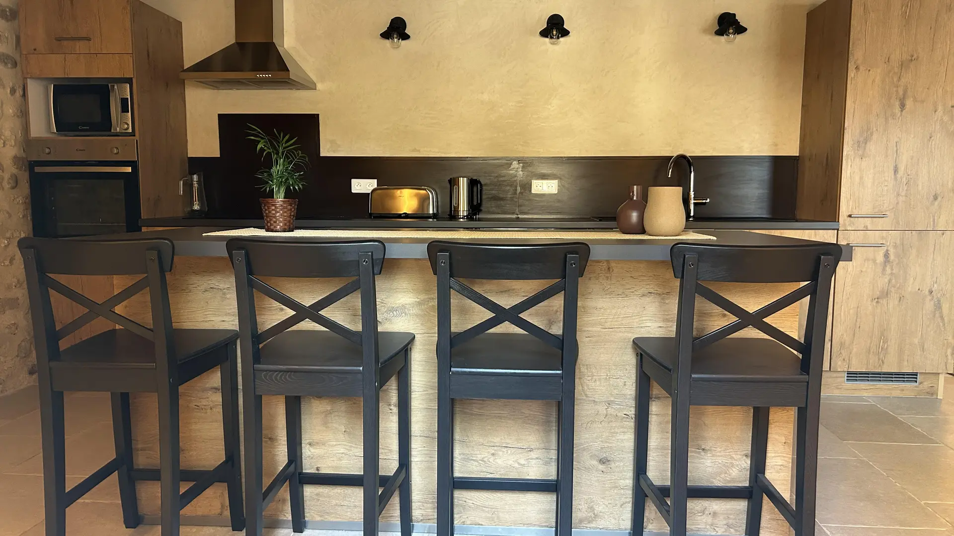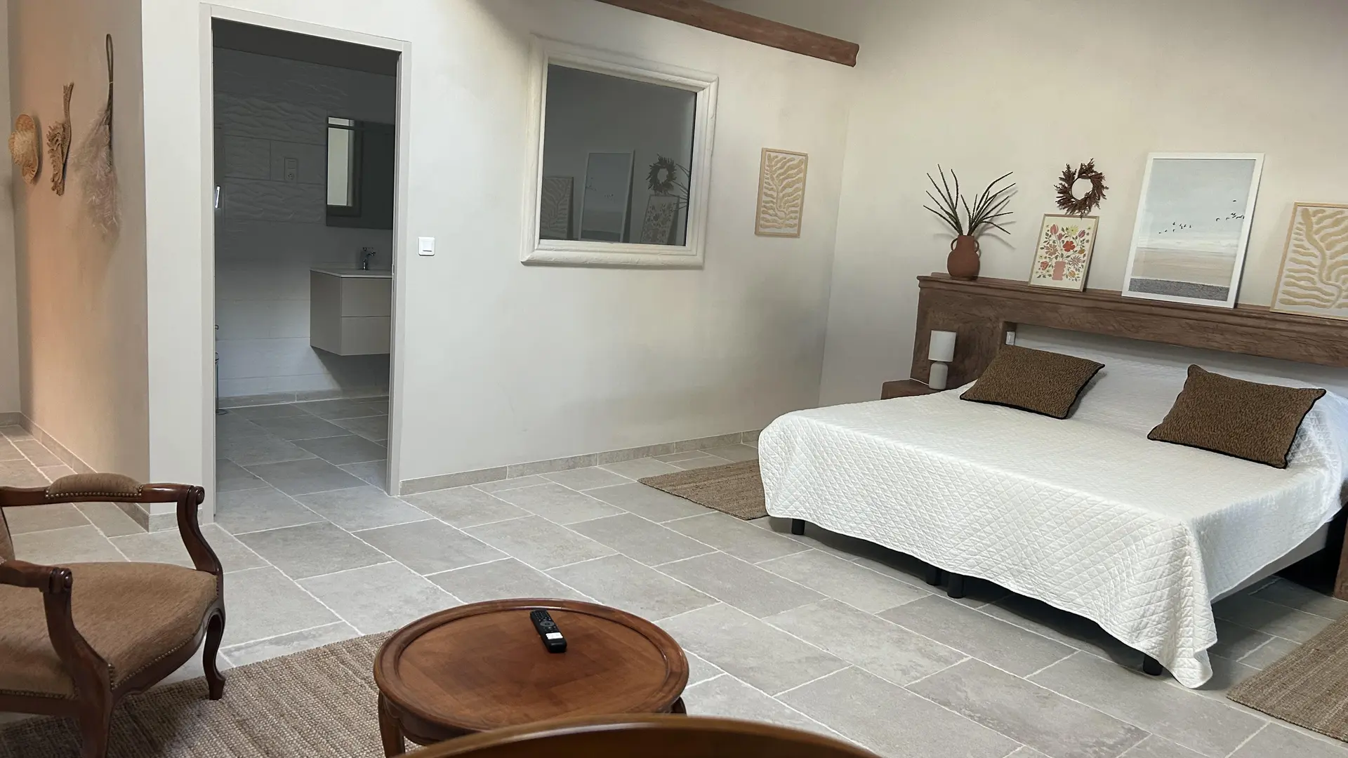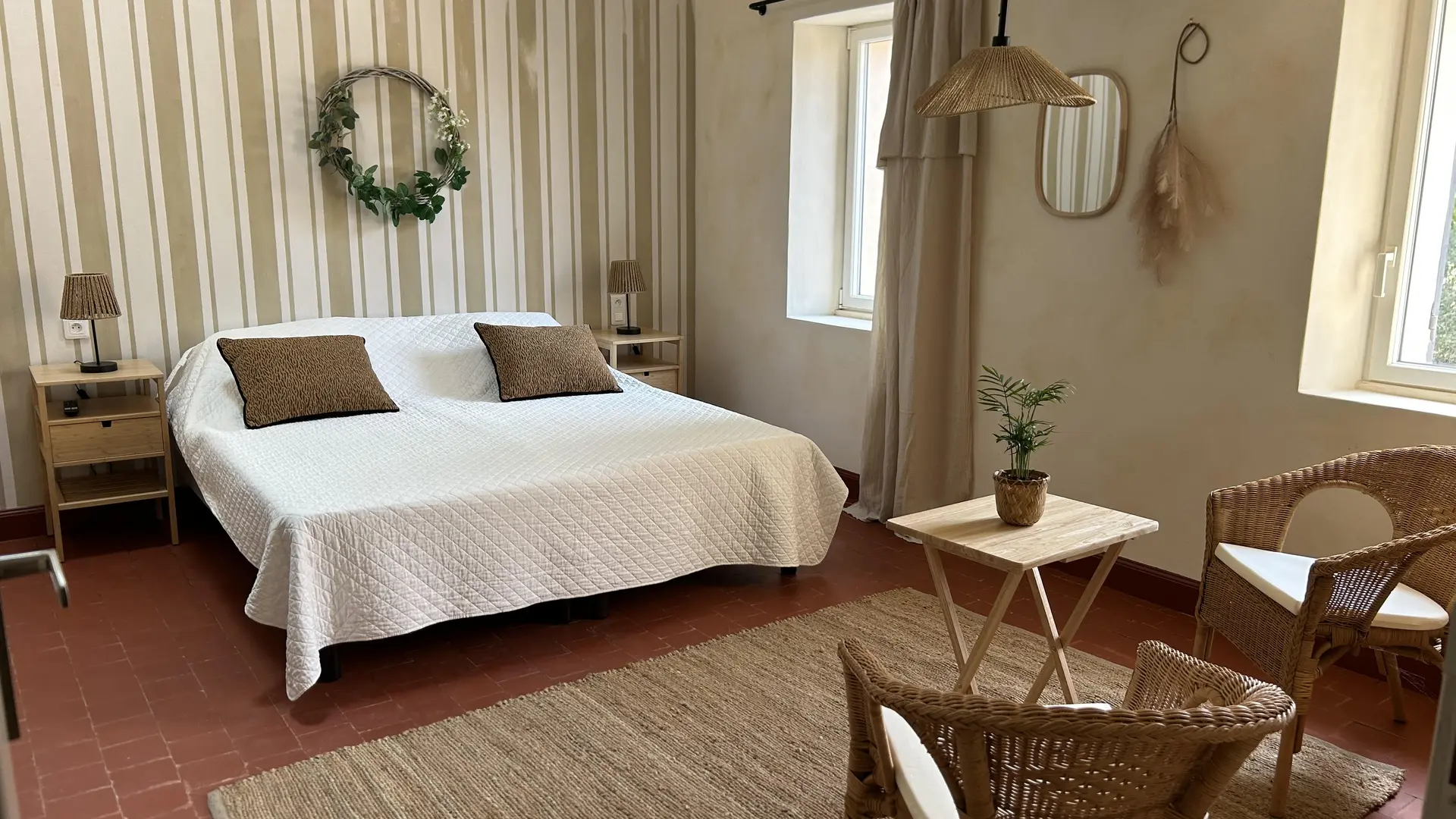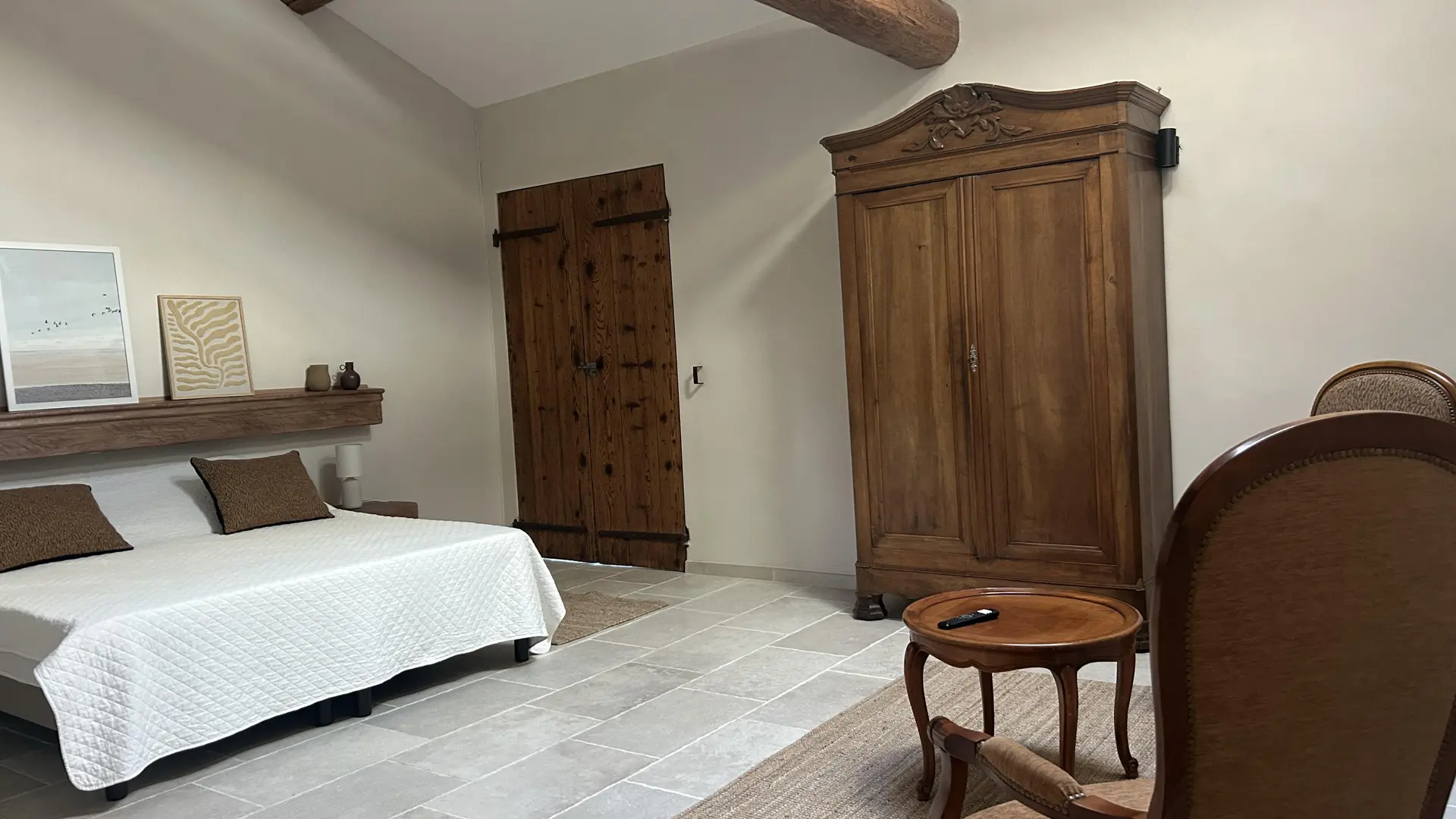 Les murs en pierre épais conservent naturellement la fraîcheur dans les pièces de vie, assurant un confort optimal tout au long de l’été. Un espace nuit pour enfant avec 2 lits simples complète l’ensemble, idéal pour un séjour en famille dans un cadre paisible et raffiné.