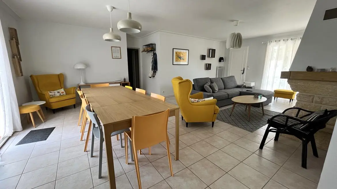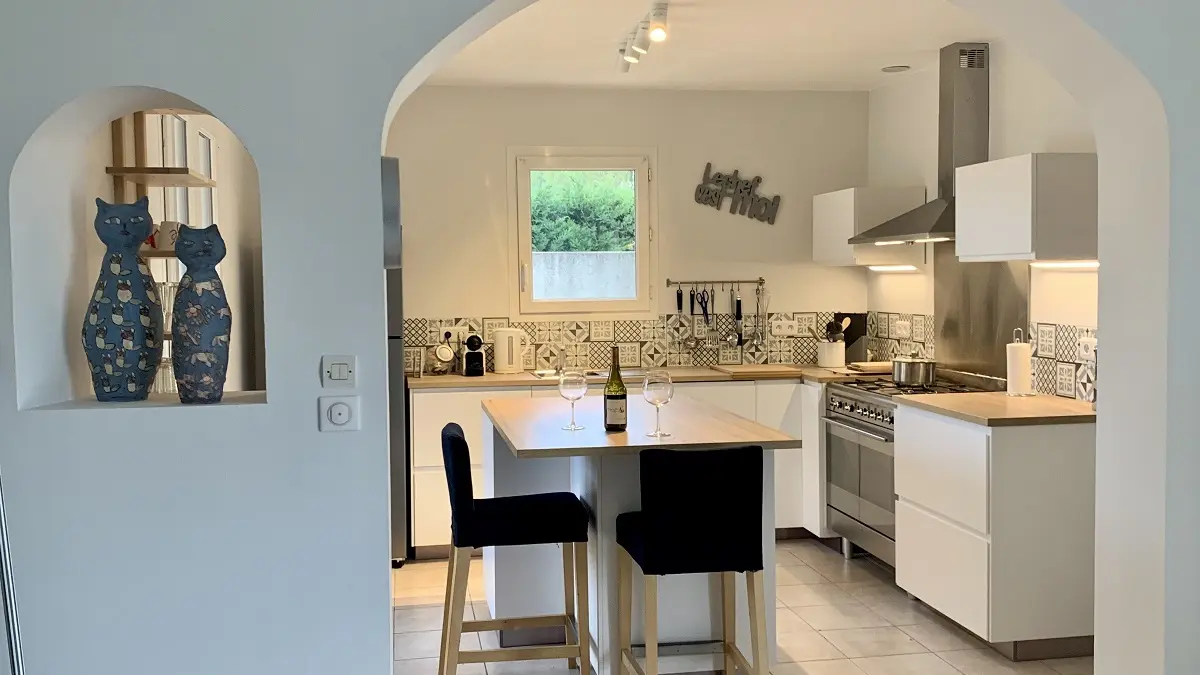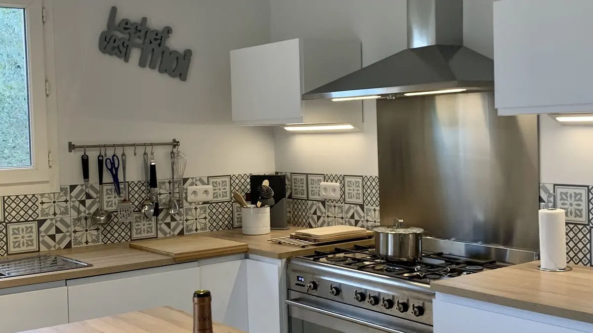 - d'un grand living de 50 m² avec une cuisine hyper équipée ( piano 5 becs gaz, grand four électrique, frigo, lave vaisselle, micro ondes), climatisation.