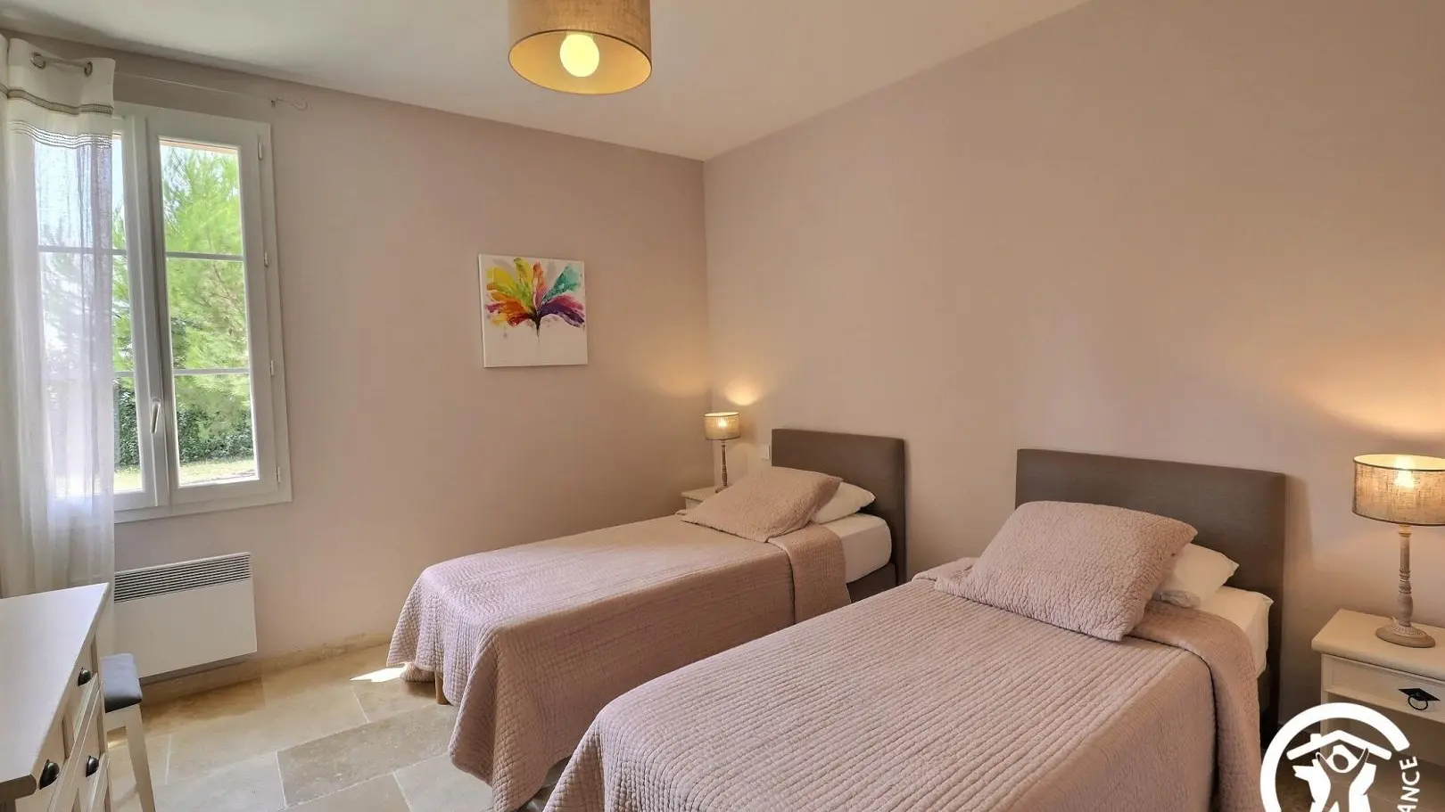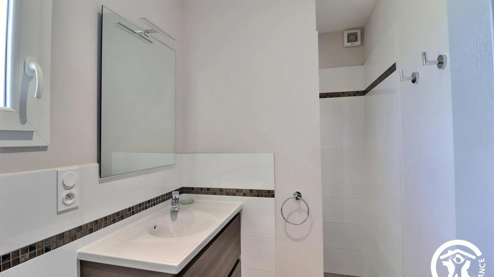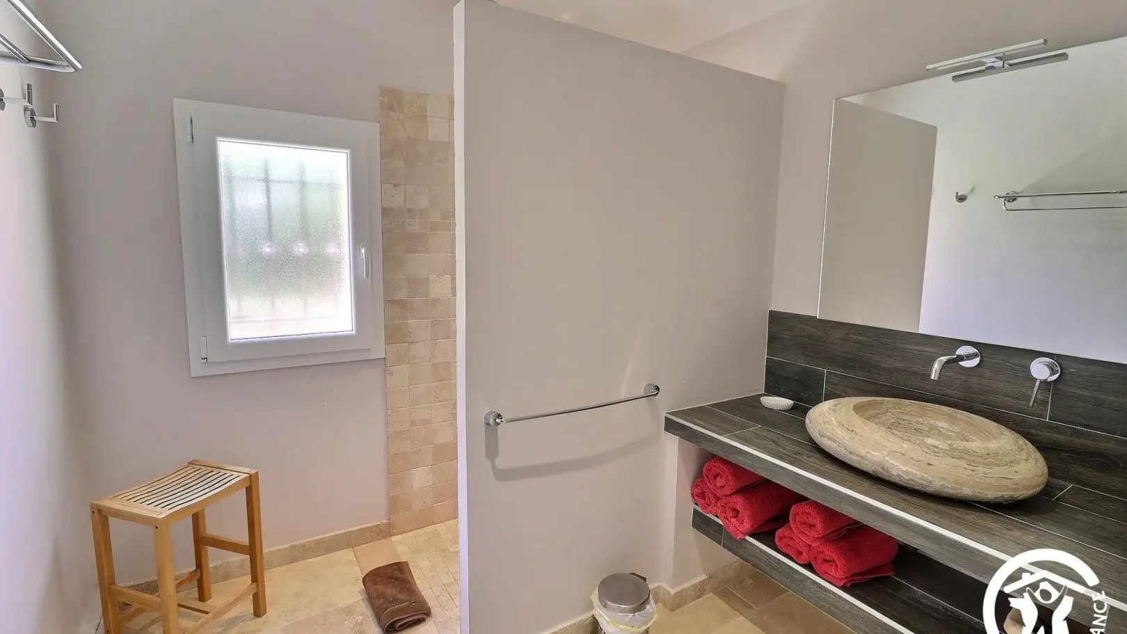 - Une chambre avec 1 lit en 160 x 200 et une deuxième avec 2 lits en 90 x 200. -Salle d'eau avec douche à l'italienne et vasque en marbre.