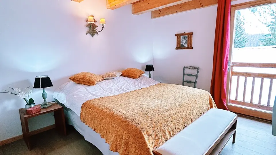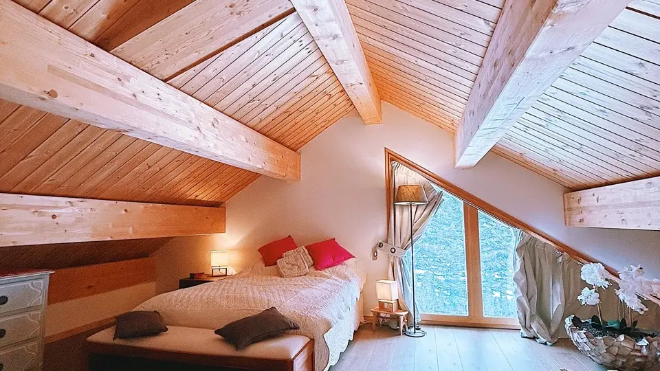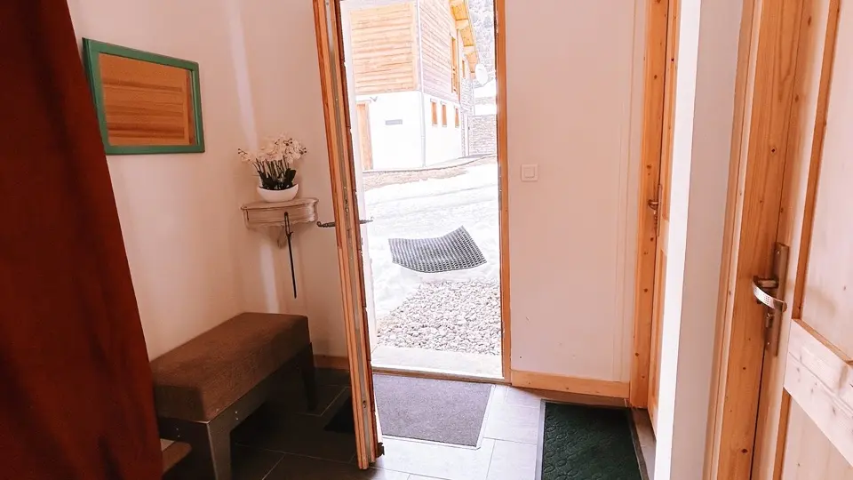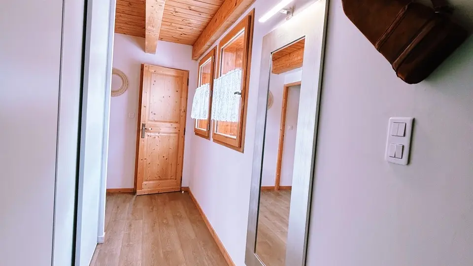 Au sein d'un chalet récent, vous avez un accès par un sas d'entrée commun donnant sur un 2nd privatif, espace buanderie, et l'appartement se trouve au 1er et 2nd étage du chalet.