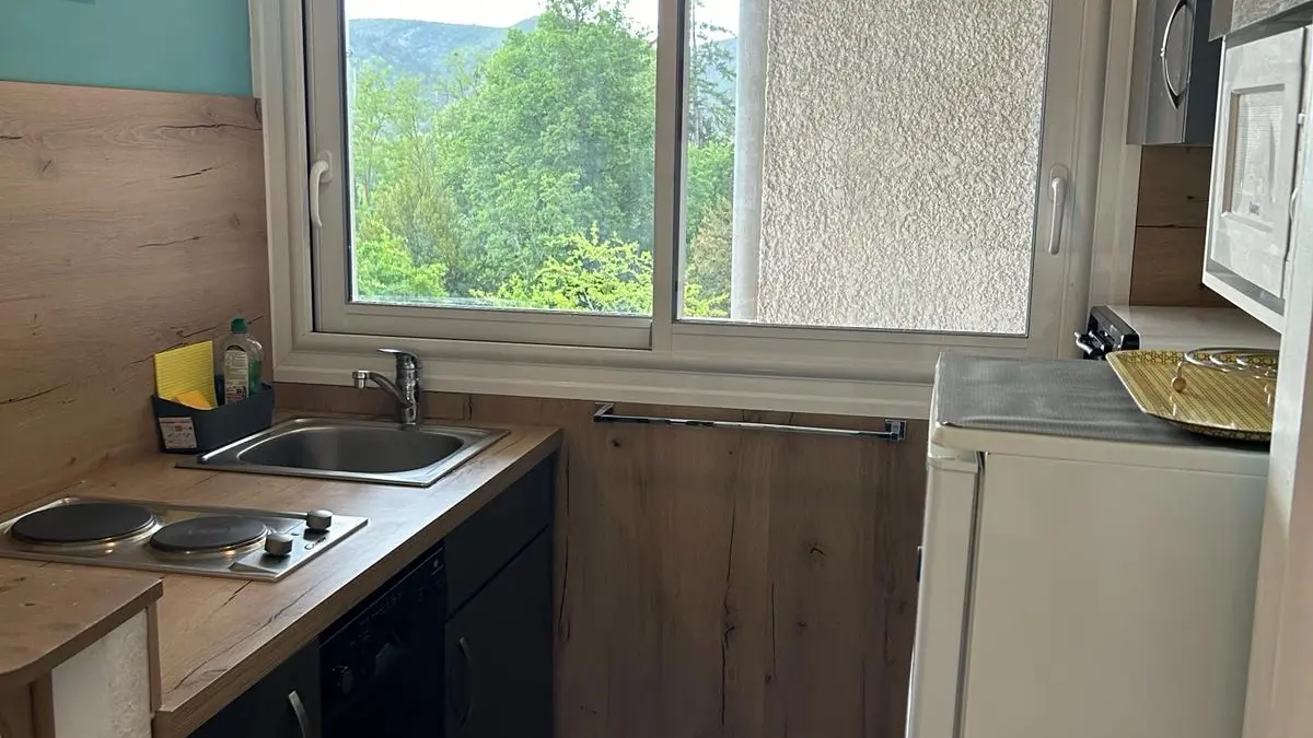 - Une kitchenette toute équipée intégrée au salon (lave vaisselle pour 4 personnes , frigidaire congélateur, mini four, micro-ondes, plaque 2 feux induction ……).