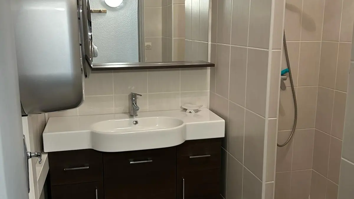 - Une salle d’eau avec une grande douche, lave linge mural de 3kg.