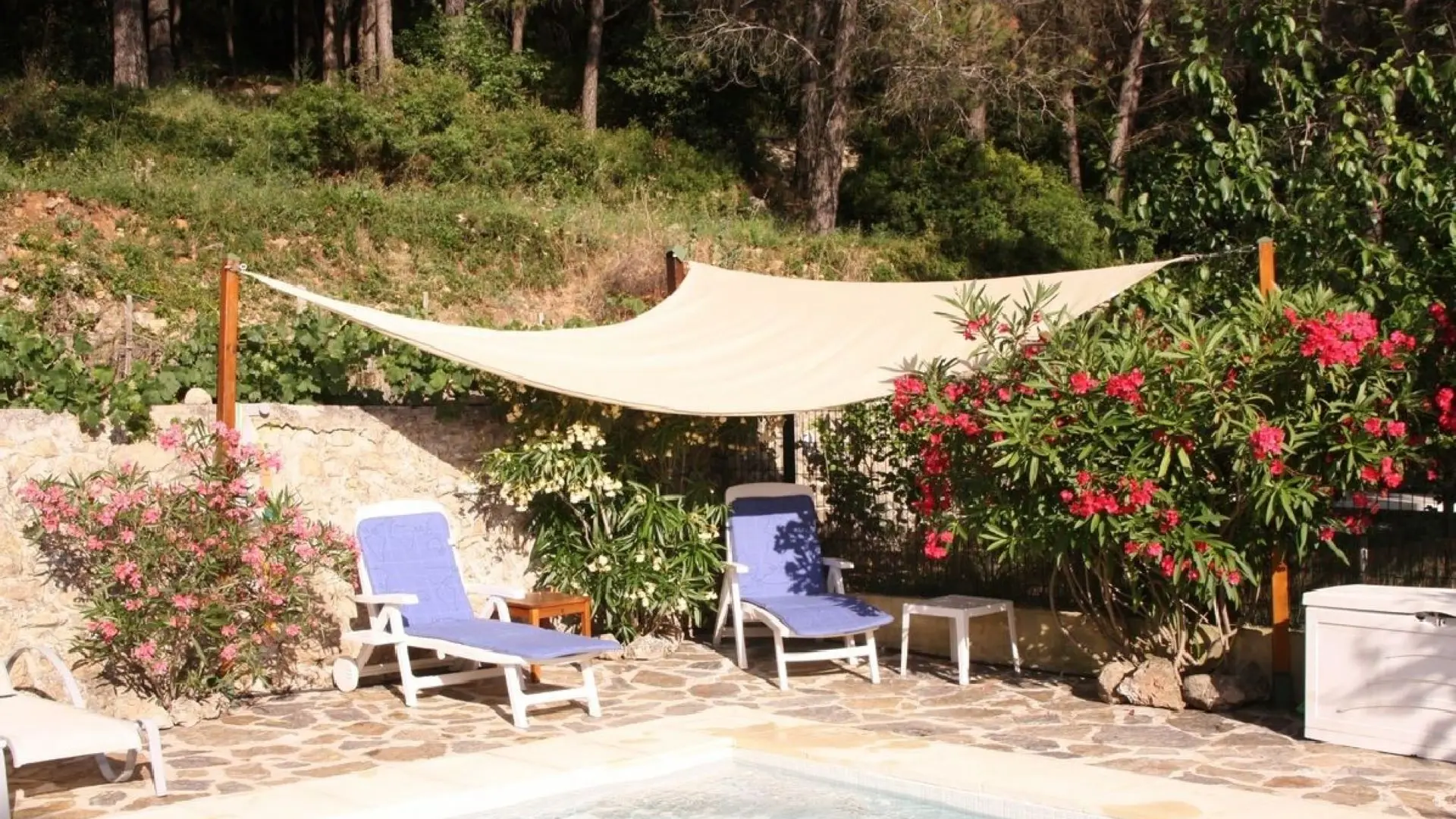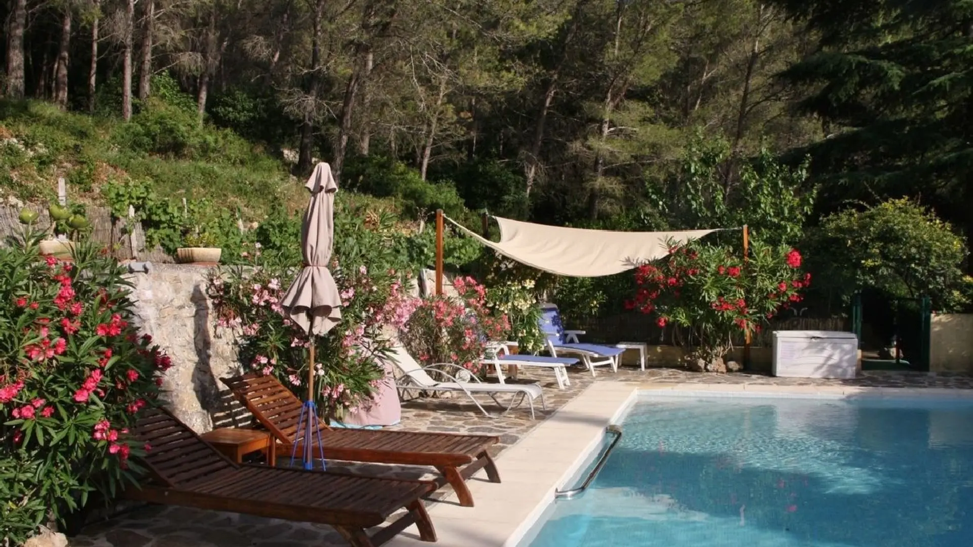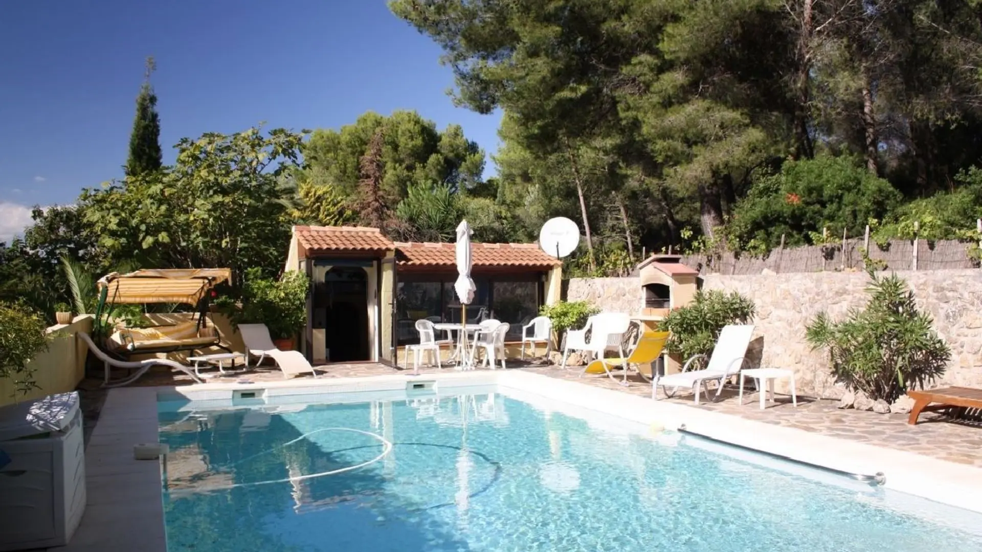 Petit pavillon indépendant dans une propriété privée de 2400m² avec piscine, en colline à 1km de la mer et des plages.