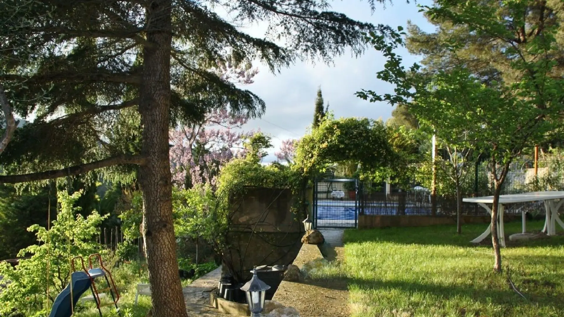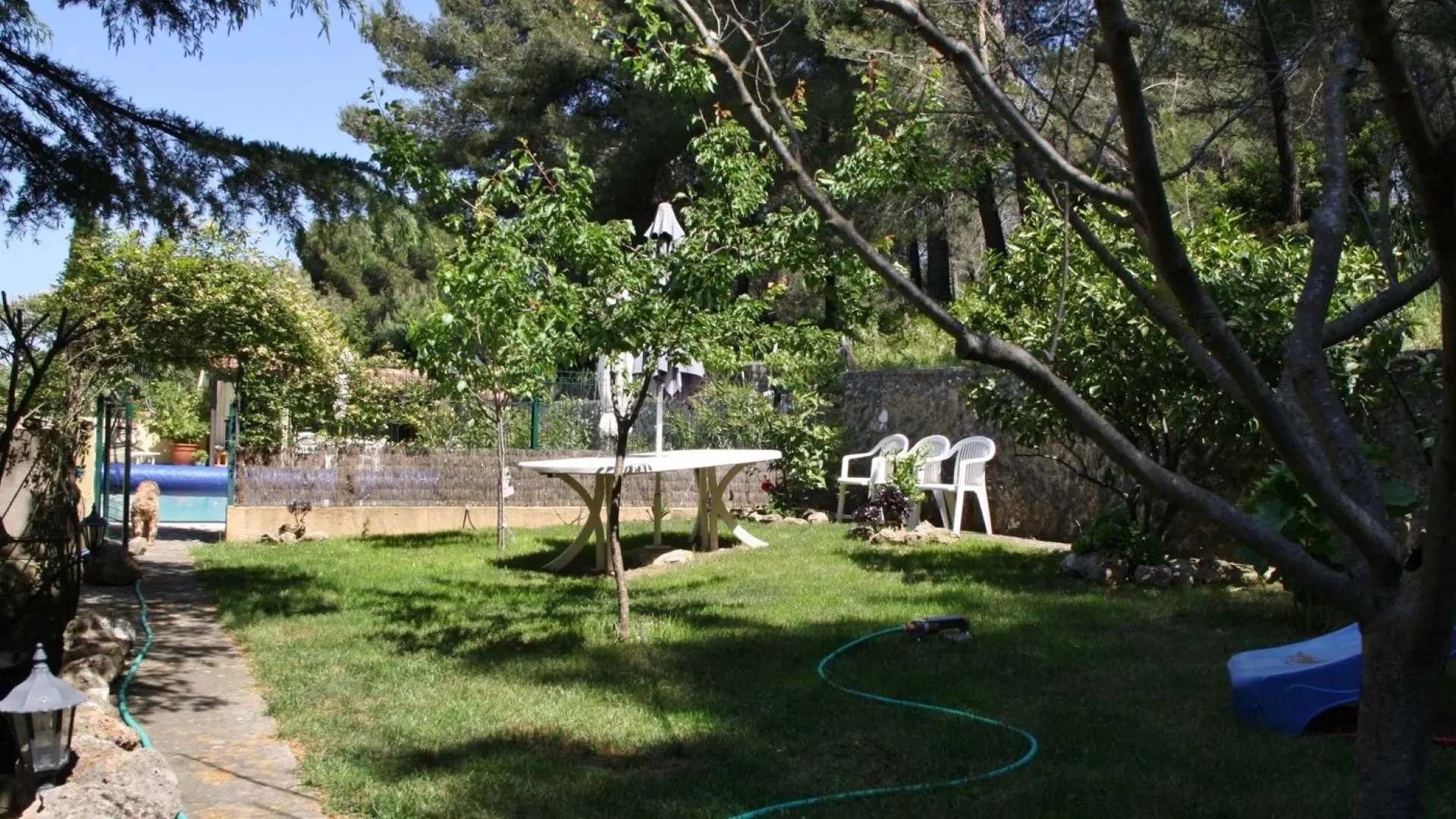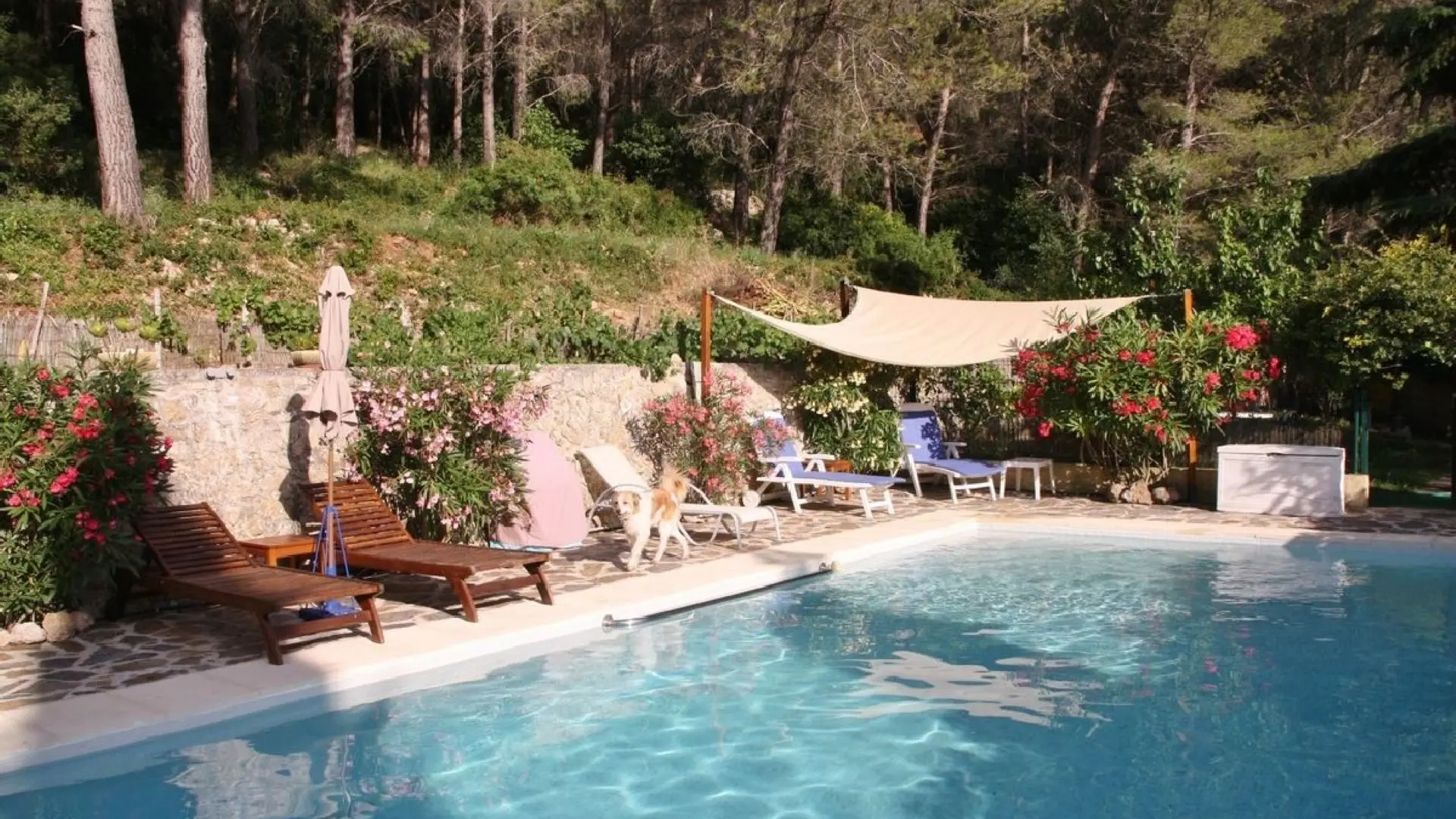 Petit pavillon indépendant dans une propriété privée de 2400m² avec piscine, en colline à 1km de la mer et des plages.