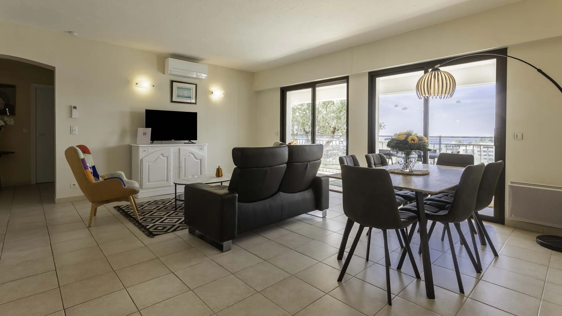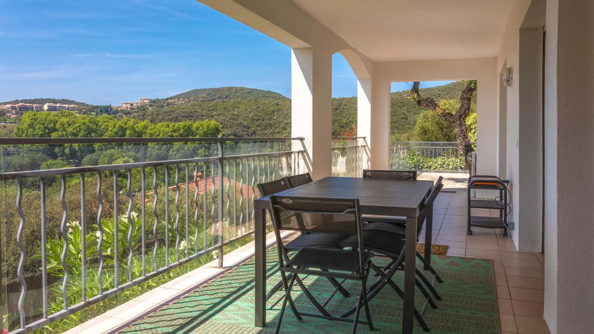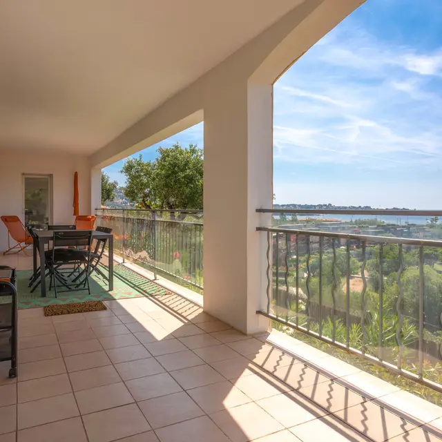 Il possède une très belle terrasse de 45 m2 et un jardin méditerranéen d'agrément. Grande Terrasse couverte avec vue mer montagne et rivière. Plein Sud, il offre un coucher de soleil côté ouest.