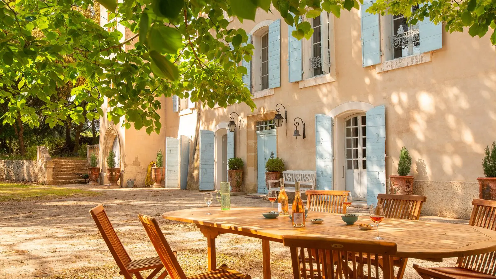 Le petit déjeuner, est servi à l’extérieur lorsque les beaux jours le permettent, à l’ombre des vieux arbres. Un instant suspendu entre soleil et fraîcheur.
