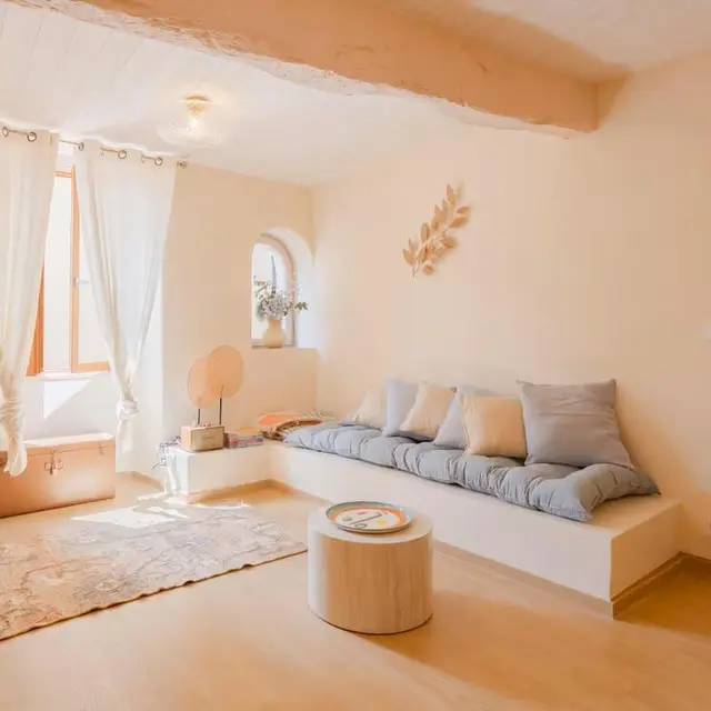 * Entrée sur un séjour lumineux comprenant un canapé-banquette.