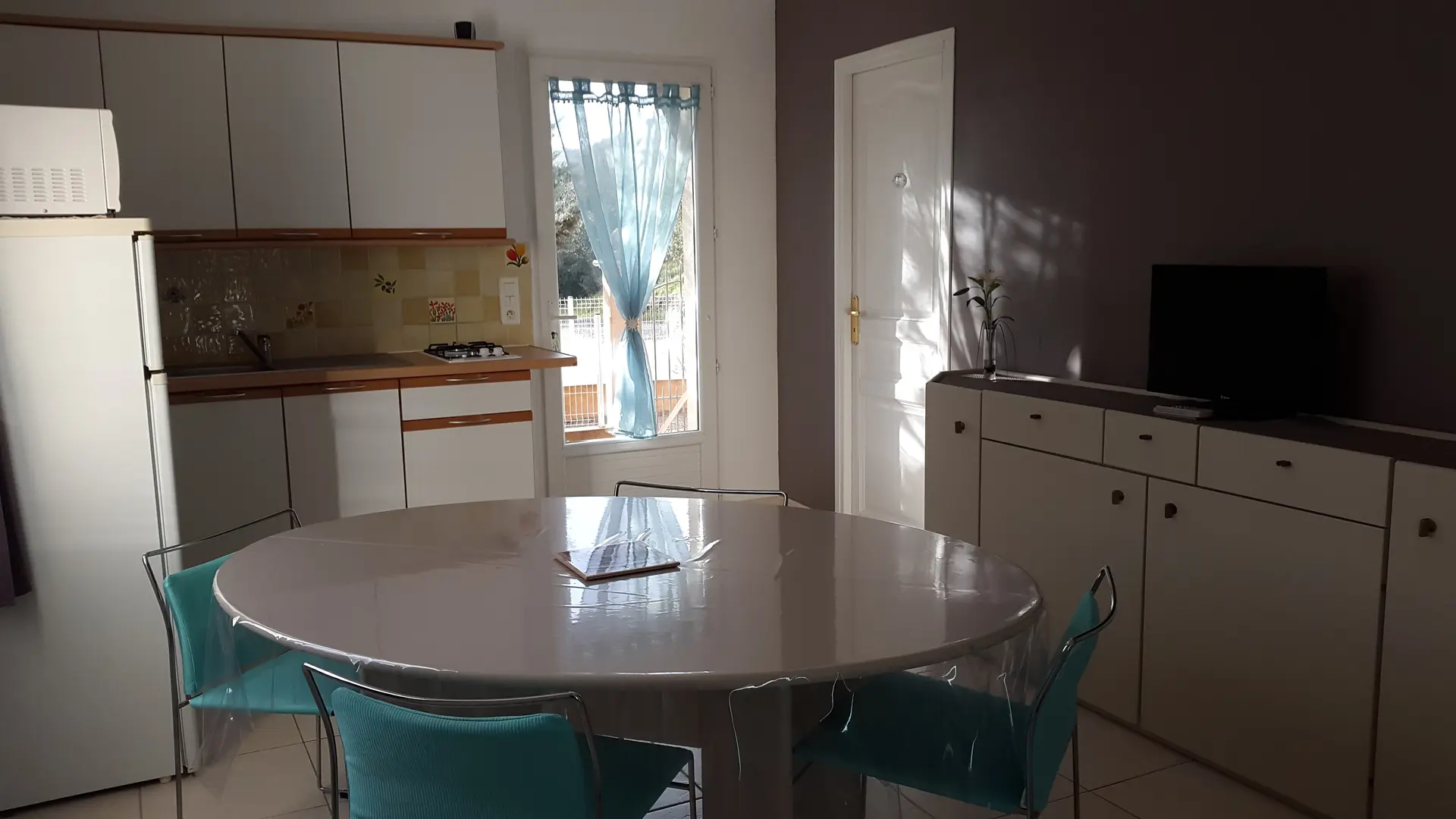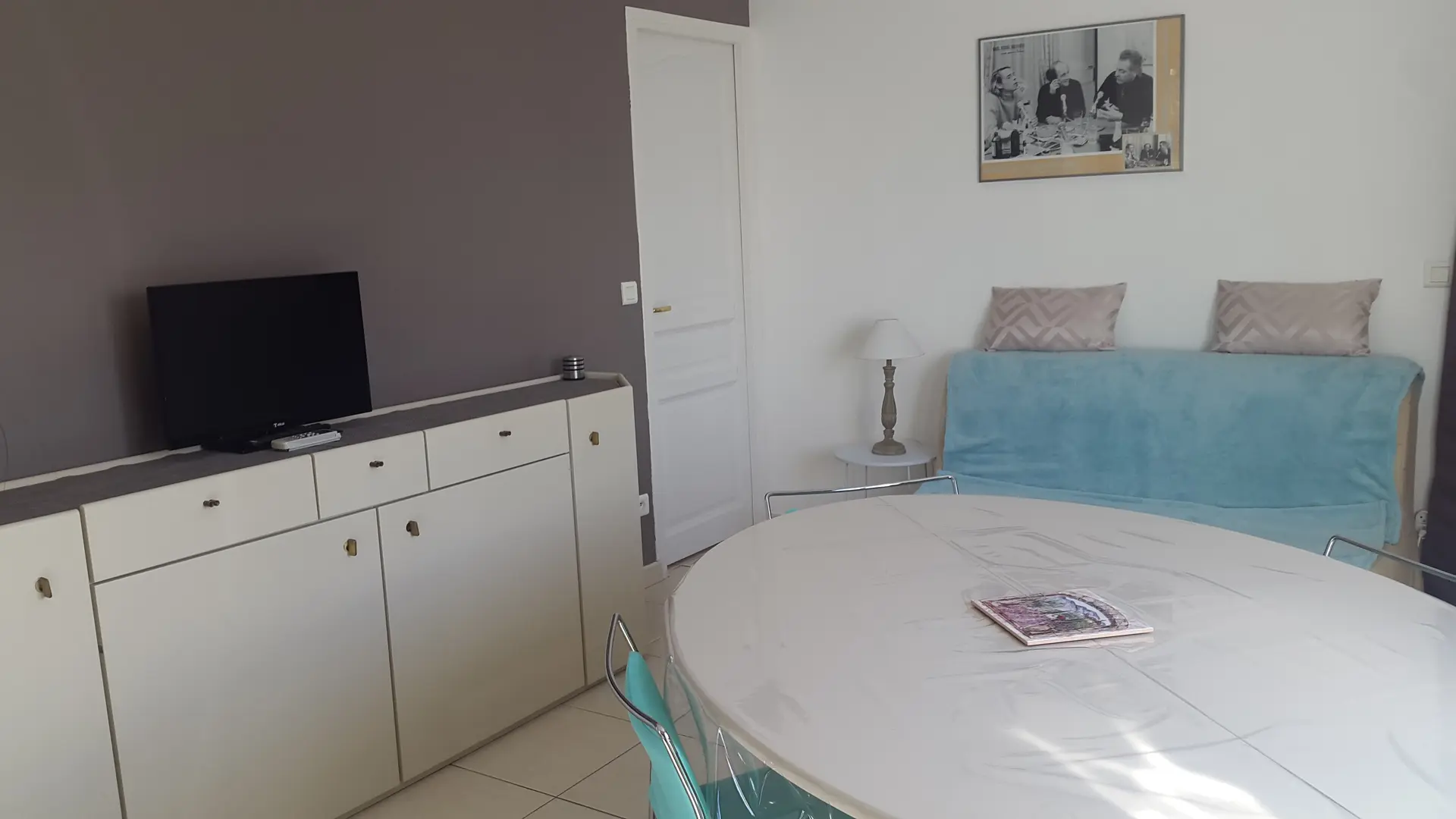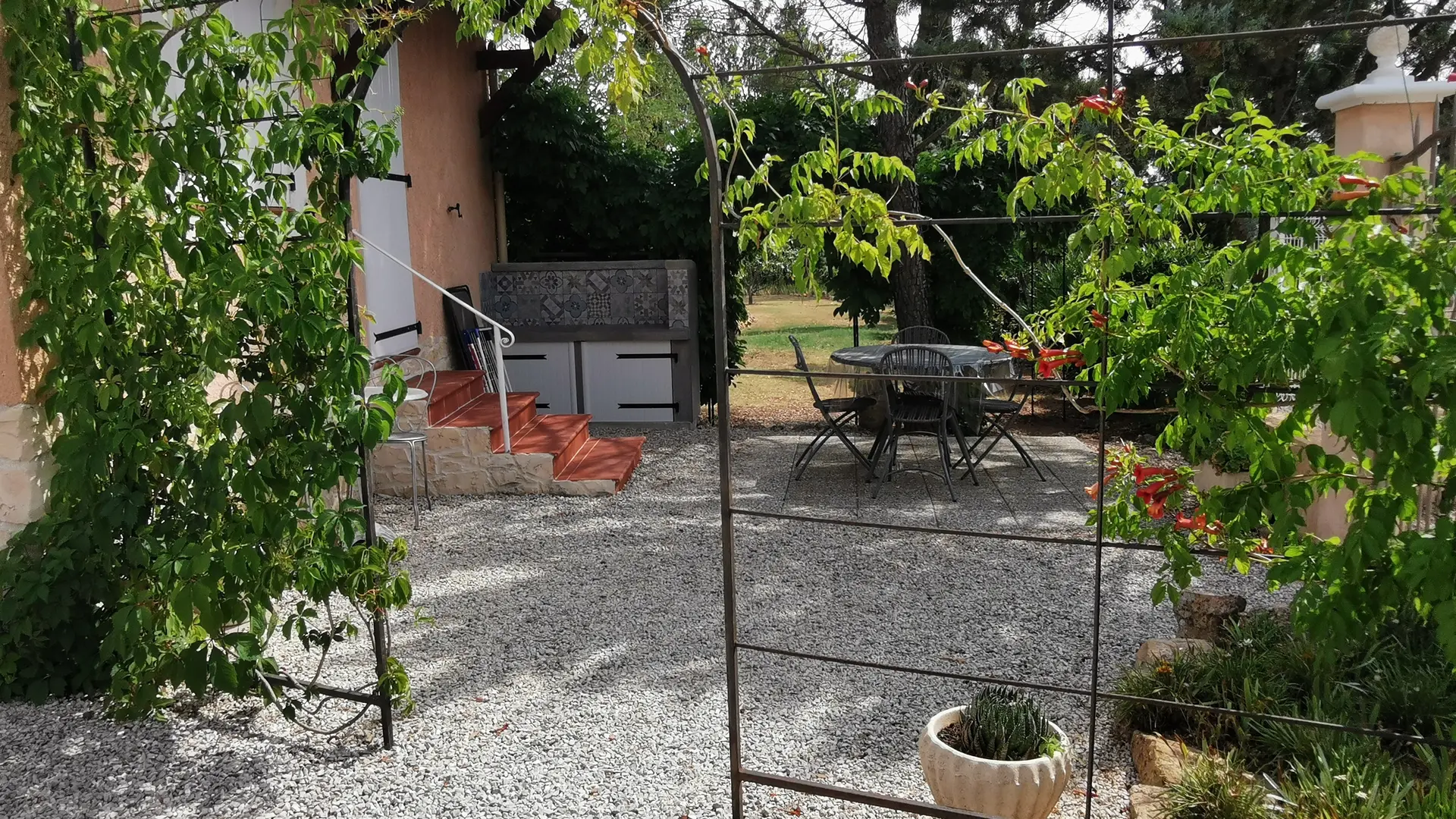 Charment gîte arboré et verdoyant F2 de 32 m² en pignon de la maison, sans vis-à-vis, logement séparé avec un petit jardin pour les repas et farniente.