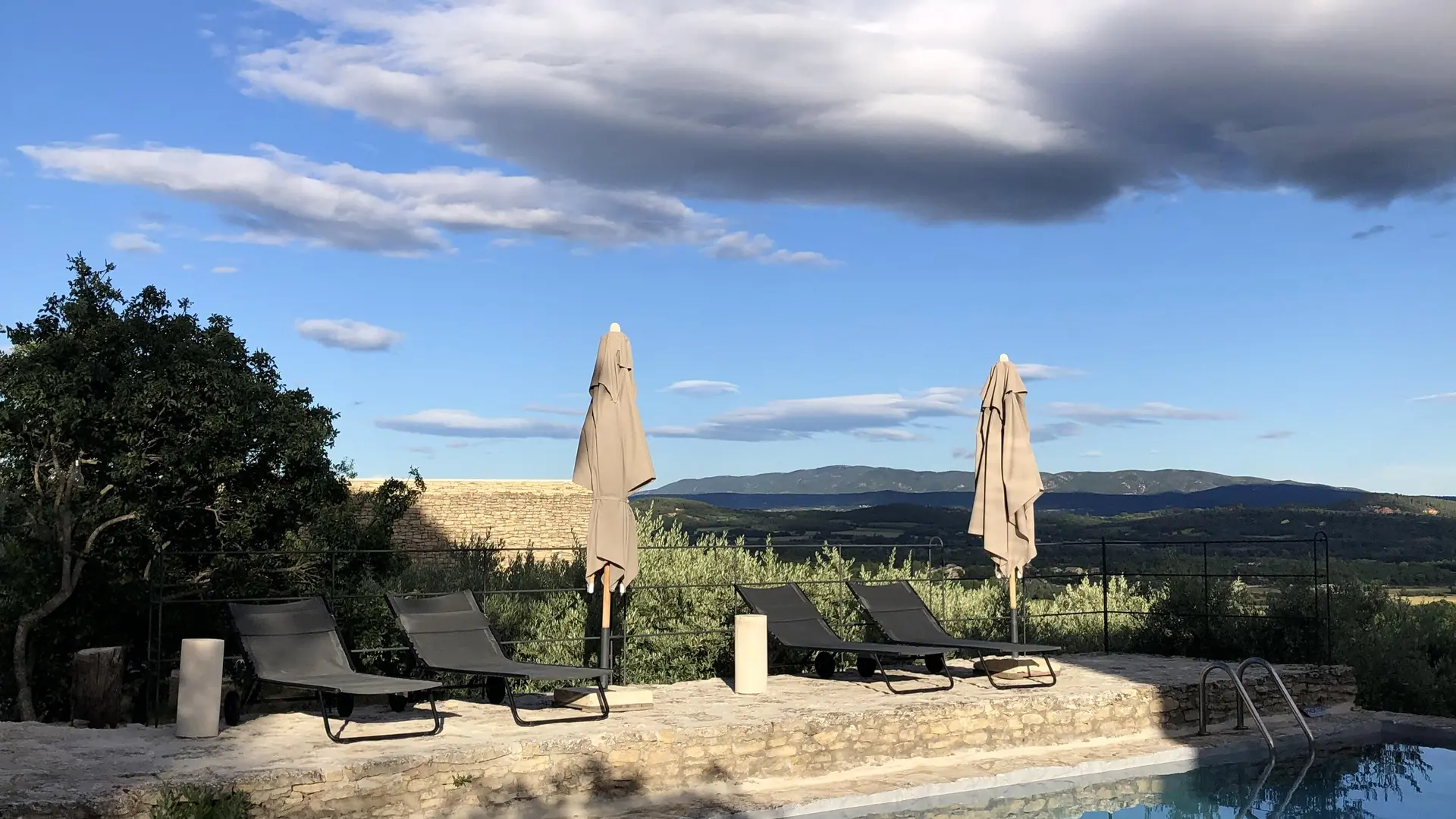 À l’abri du mistral, la propriété, composée de terrasses en restanques plantées d’oliviers, de vignes et d’arbres fruitiers offrira à ses visiteurs une vue incomparable sur le massif du Luberon et les «plus beaux villages»: Roussillon, Bonnieux, Lacoste… qui se prosternent face à elle.