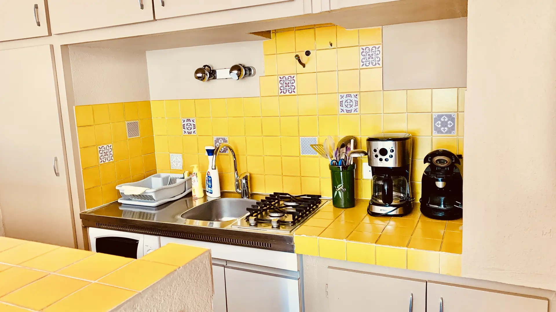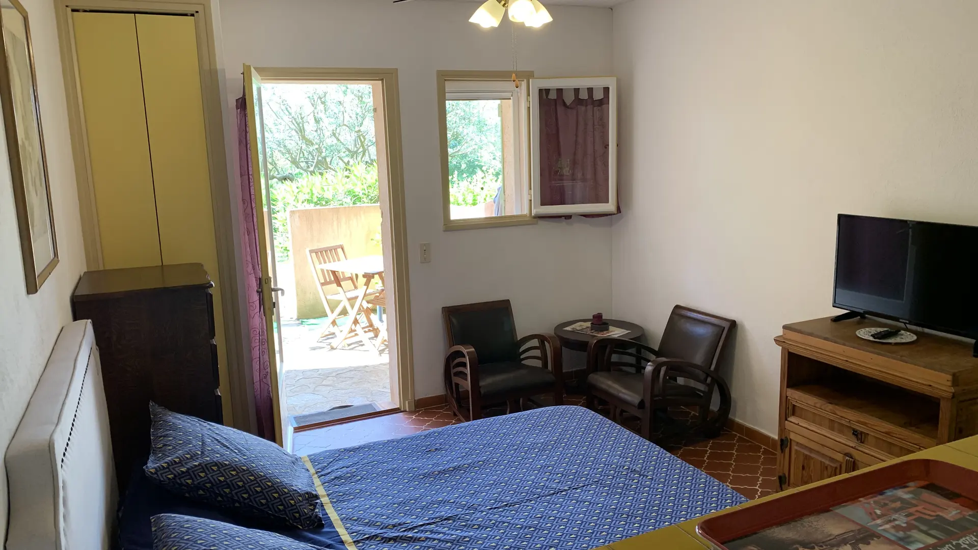 Studios climatisés en rez-de-jardin avec terrasse. Ils se composent d'une kitchenette, un petit coin salon, un lit pour deux personnes et une salle de bain avec une douche, lavabo et WC.