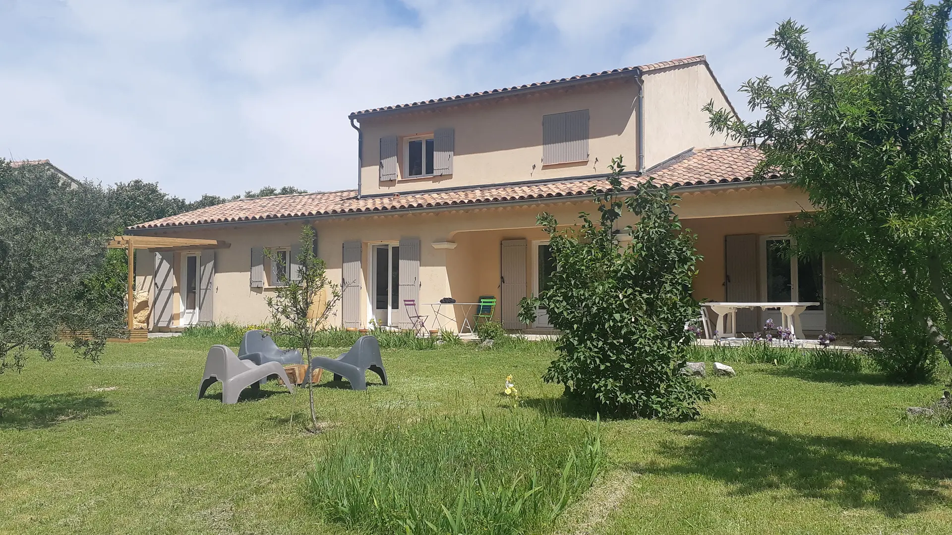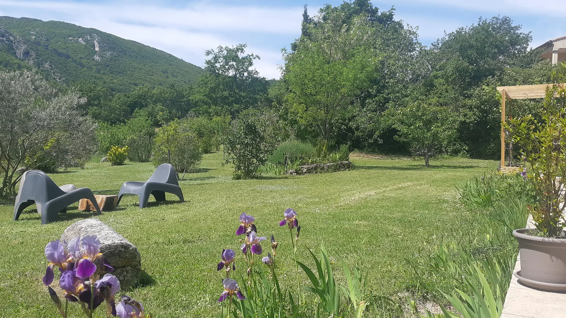 Toutes les pièces du rez-de-chaussée ont un accès sur la terrasse avec vue sur un jardin bucolique plein sud avec vue sur le Lubéron.