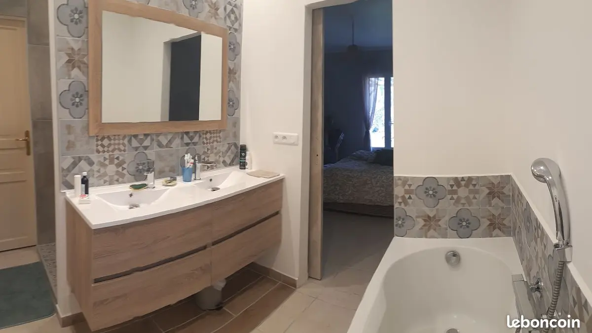 1 grande chambre parentale de 20m² avec 1 lit 140x190 , sa salle de bains attenante (baignoire , douche et double vasques) et un dressing.