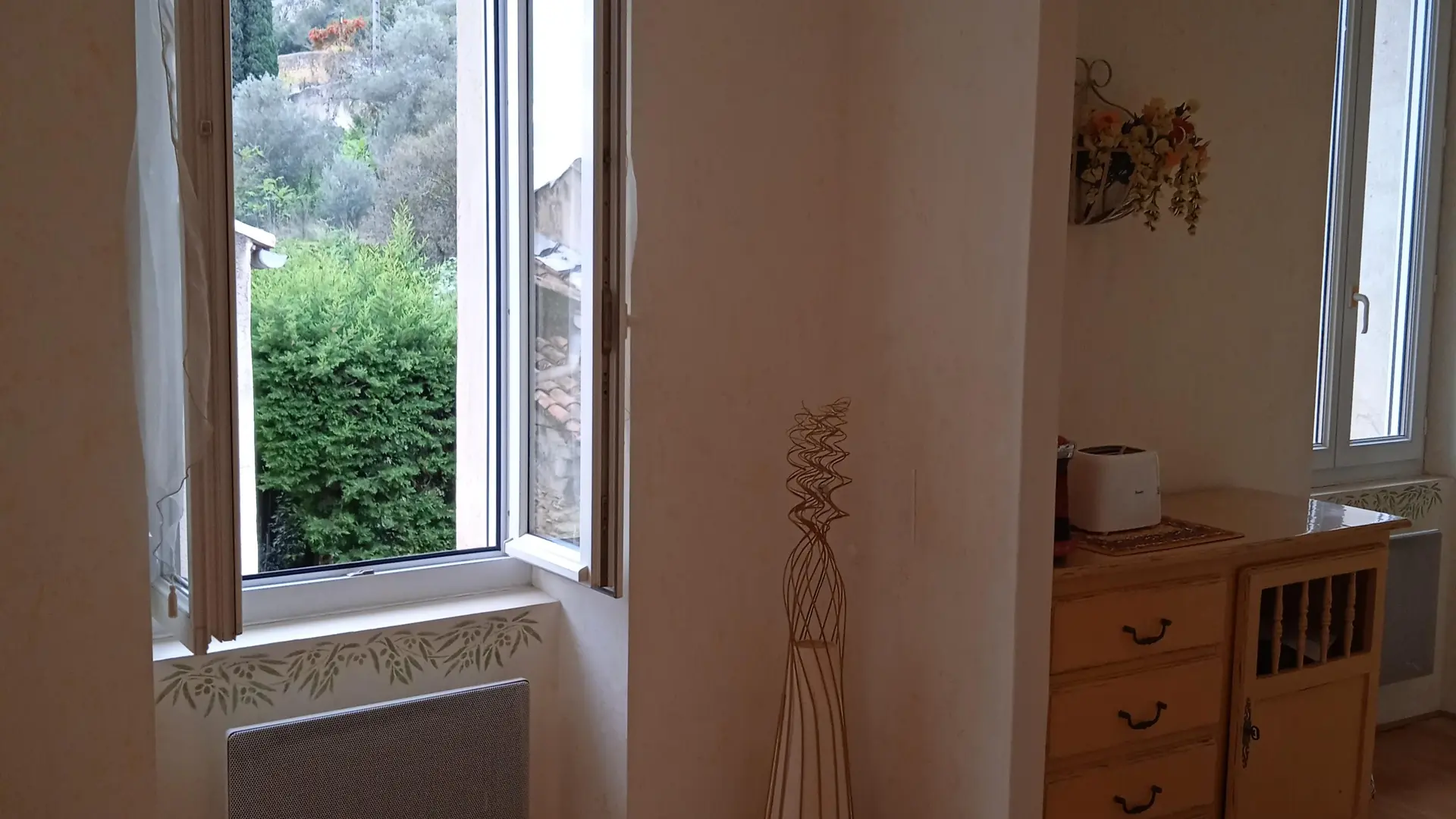 Entrée indépendante. Dégagement, grande pièce à vivre avec canapé convertible couchage 90 (plutôt pour enfant ou adolescent) TV écran plat 80 cm, cuisine équipée: plaque vitro,four, micro onde,réfrigérateur/congélateur, petit électro ménager, vaisselle harmonisée; Chambre avec vue sur colline, fermée avec lit de 140 et grand placard mural. Salle d'eau avec douche,lavabo et WC, sèche serviette, sèche cheveux. Doubles vitrages et .isolation, chauffage radiants. Eté ventilateurs Bibliothèque. Logement non fumeur. Matériel de repassage et de ménage. Lave linge commun avec propriétaire dans dépendance en rez de chaussée, étendage dans cour ou jardin.Table et fauteuils dans le jardin