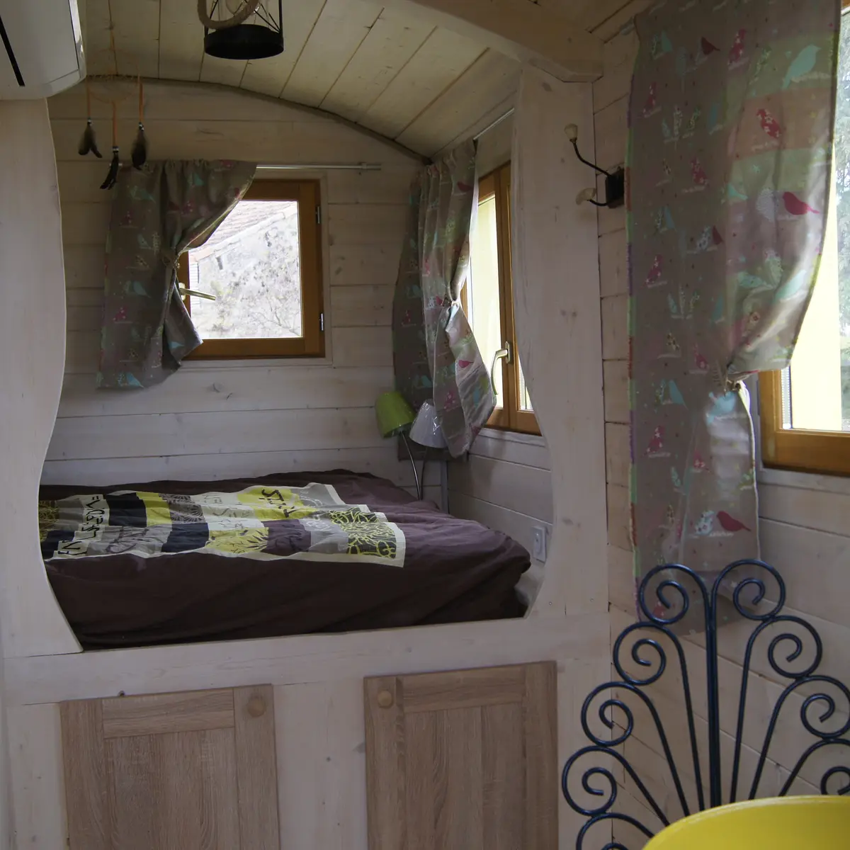 De charmantes petites roulottes colorées, climatisées, avec terrasse, douche et WC.