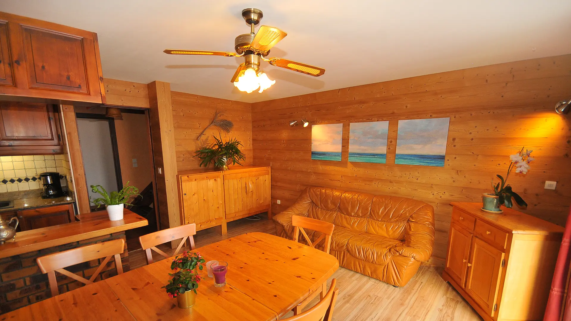 Descriptif : Une entrée, un séjour avec cuisine équipée, sanitaires et balcon. Un canapé convertible en lit 160x200.
