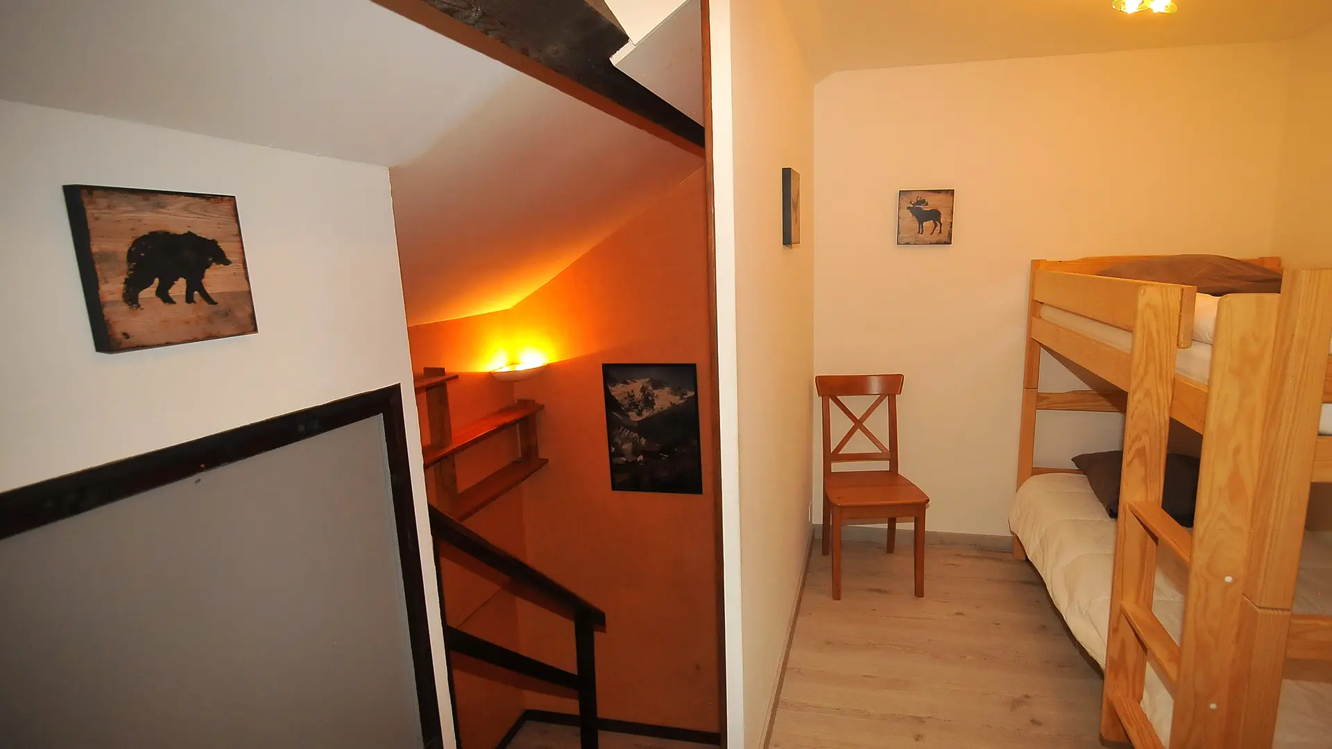 A l’étage : Une chambre pour 2 personnes (1 lit 140), un coin nuit pour 2 personnes (2 lits superposés de 90) et une salle de bain avec douche.