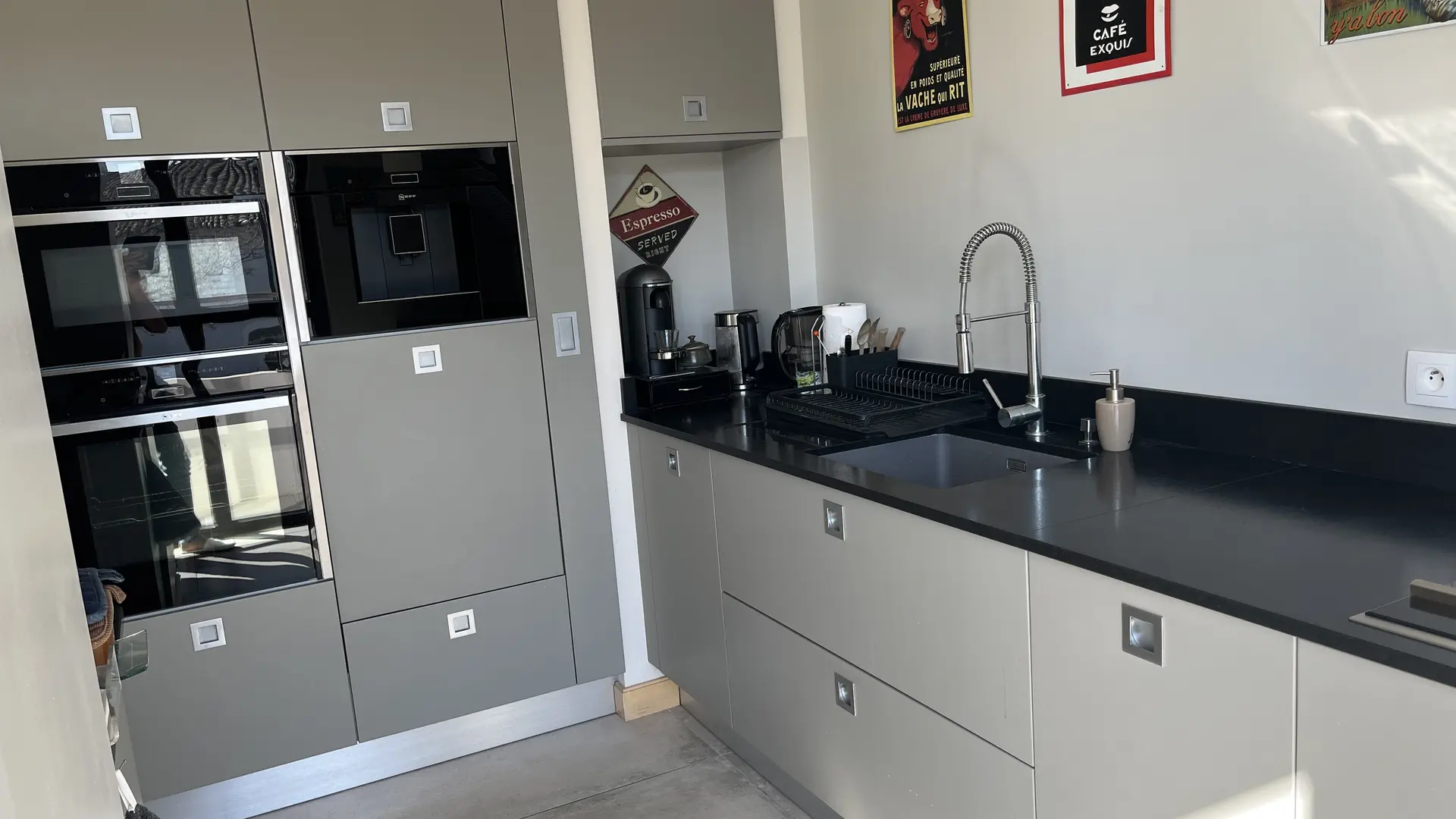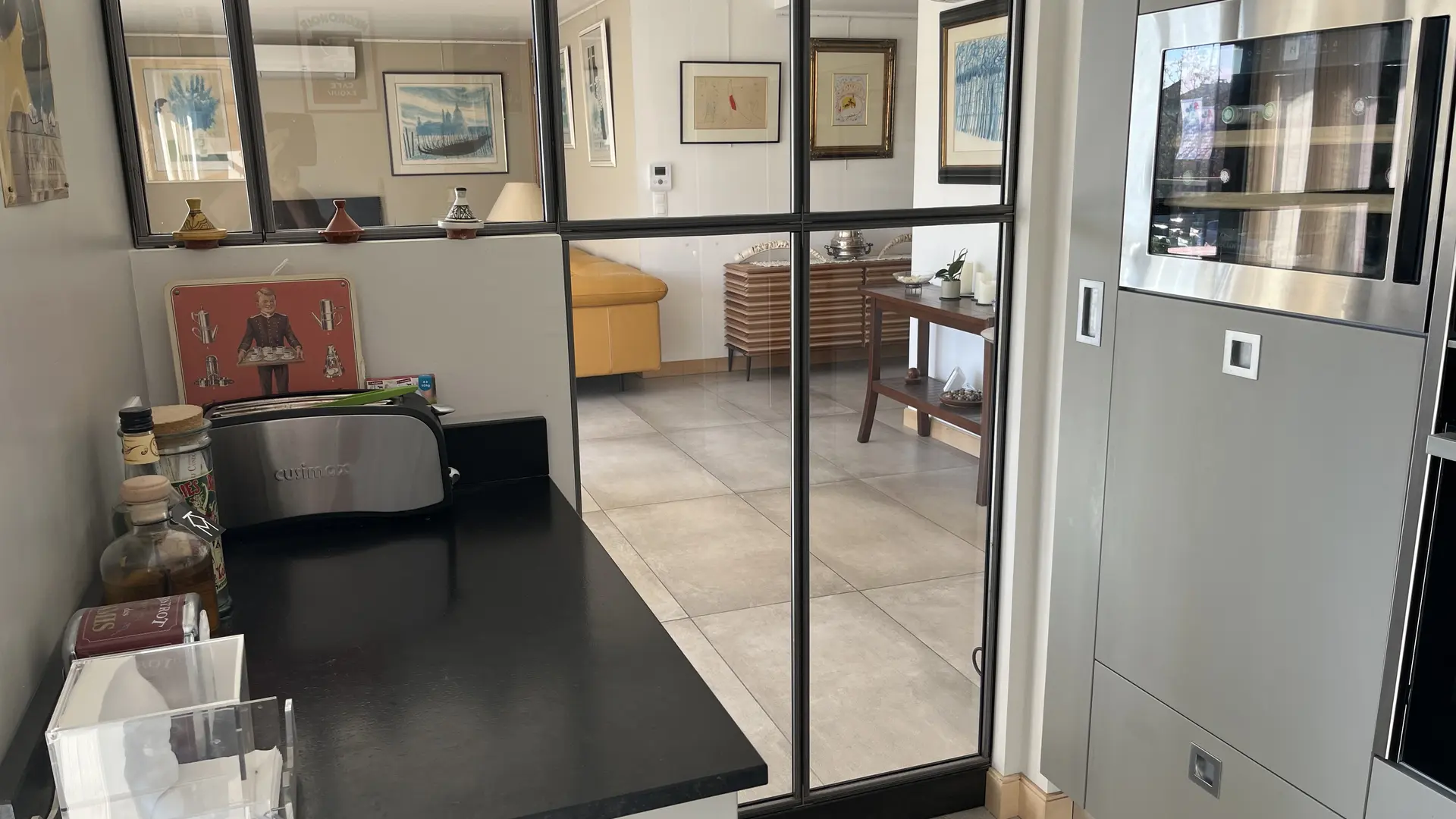Cuisine équipée high-tech intégrant micro-ondes, four, cave à vin, machine à café, friteuse, plancha,plaque induction ouverte sur le salon avec verrière