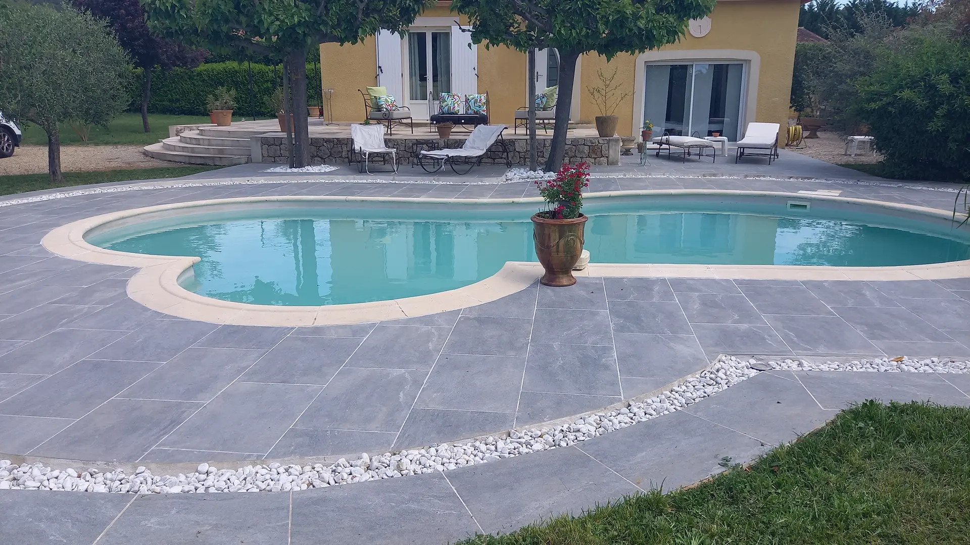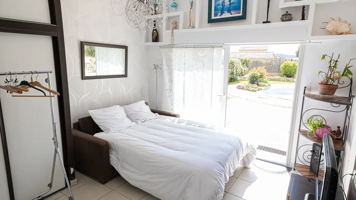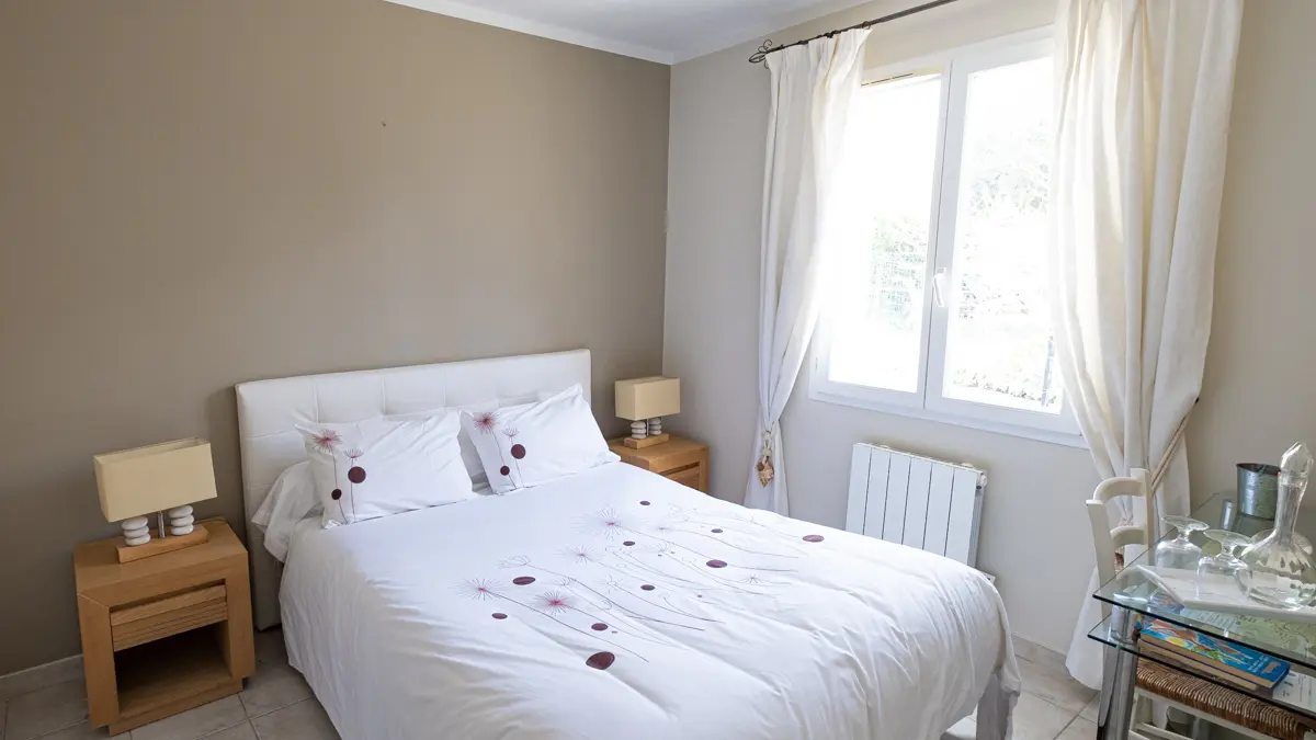 Chambre exposée à l'Est, l'autre au Nord. Et la troisième propose une vue sur la piscine et le jardin.