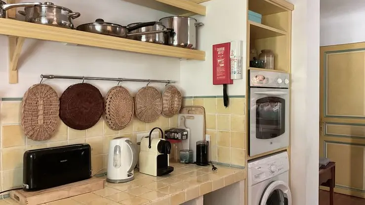 Cuisine avec une porte donnant à l'arrière de la maison, et vers les poubelles de tri. Et une seconde porte vers le cellier pour tous les autres équipements ainsi que pour le rangement des courses.