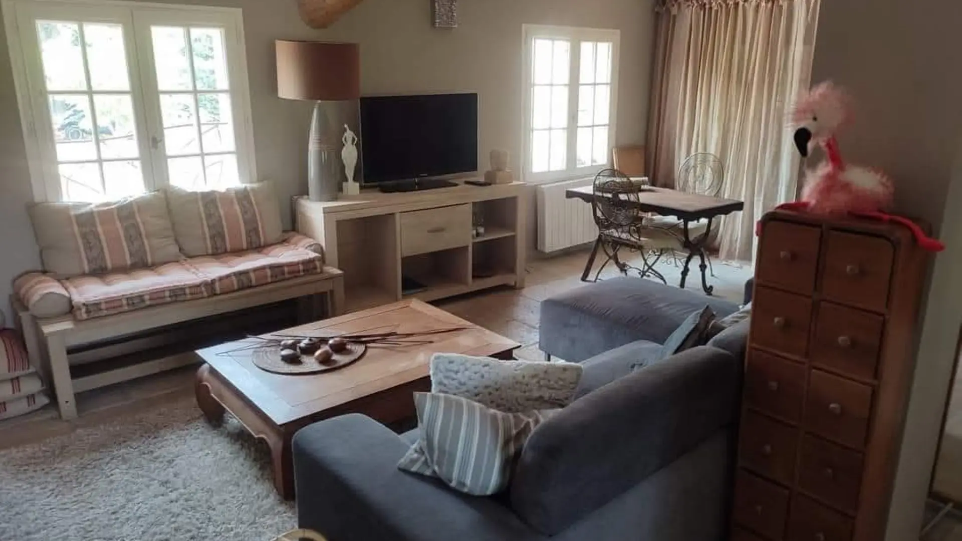 1er étage : cuisine ouverte sur salon/cheminée avec insert, salle à manger ouvrant sur terrasse couverte de 10m2. Le palier est un espace commun avec un accès WIFI.