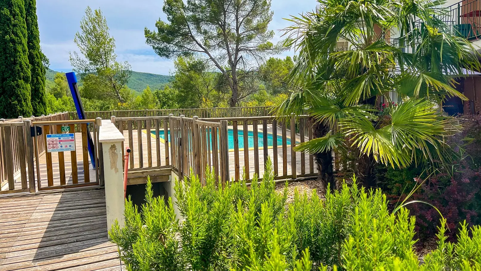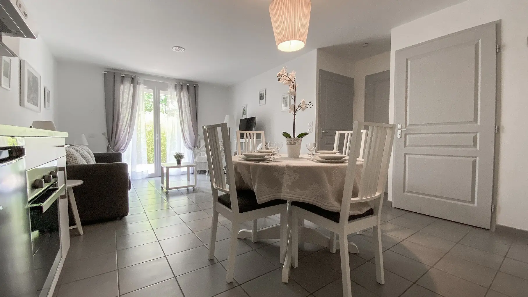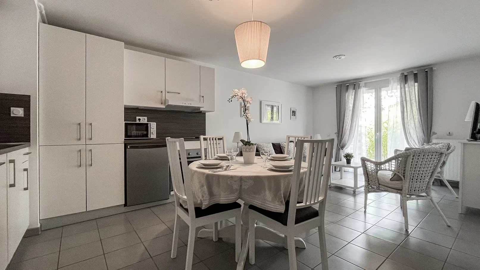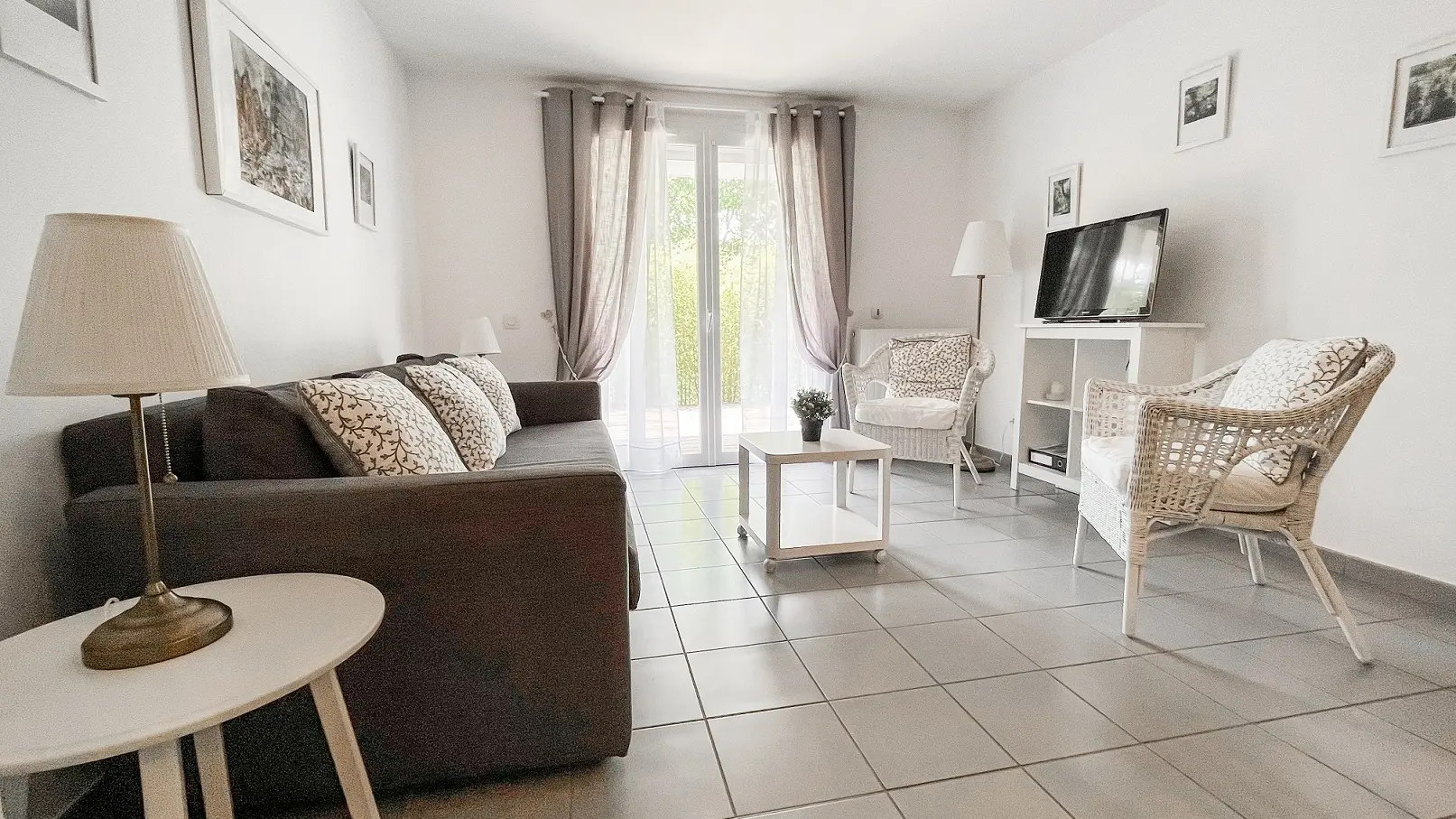 Appartement T2 de 44m2 dans résidence, entièrement équipé, au RDC avec terrasse de 20 m2, sans vis à vis, avec garage privé. Piscine de la résidence. A deux pas des thermes de Gréoux. Parfait pour curistes.