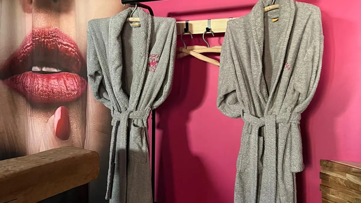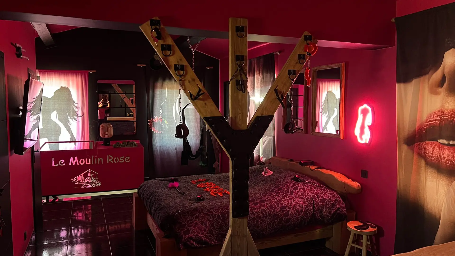 Pour pimenter ce moment et laisser libre cours à votre imagination, des accessoires coquins sont à votre disposition : attaches poignets et chevilles, menottes, croix de Saint André, balançoire, fouet, masque, cravache, miroirs.