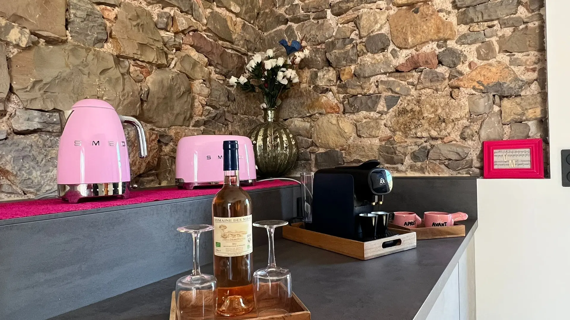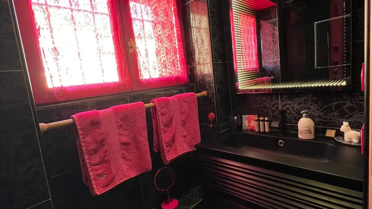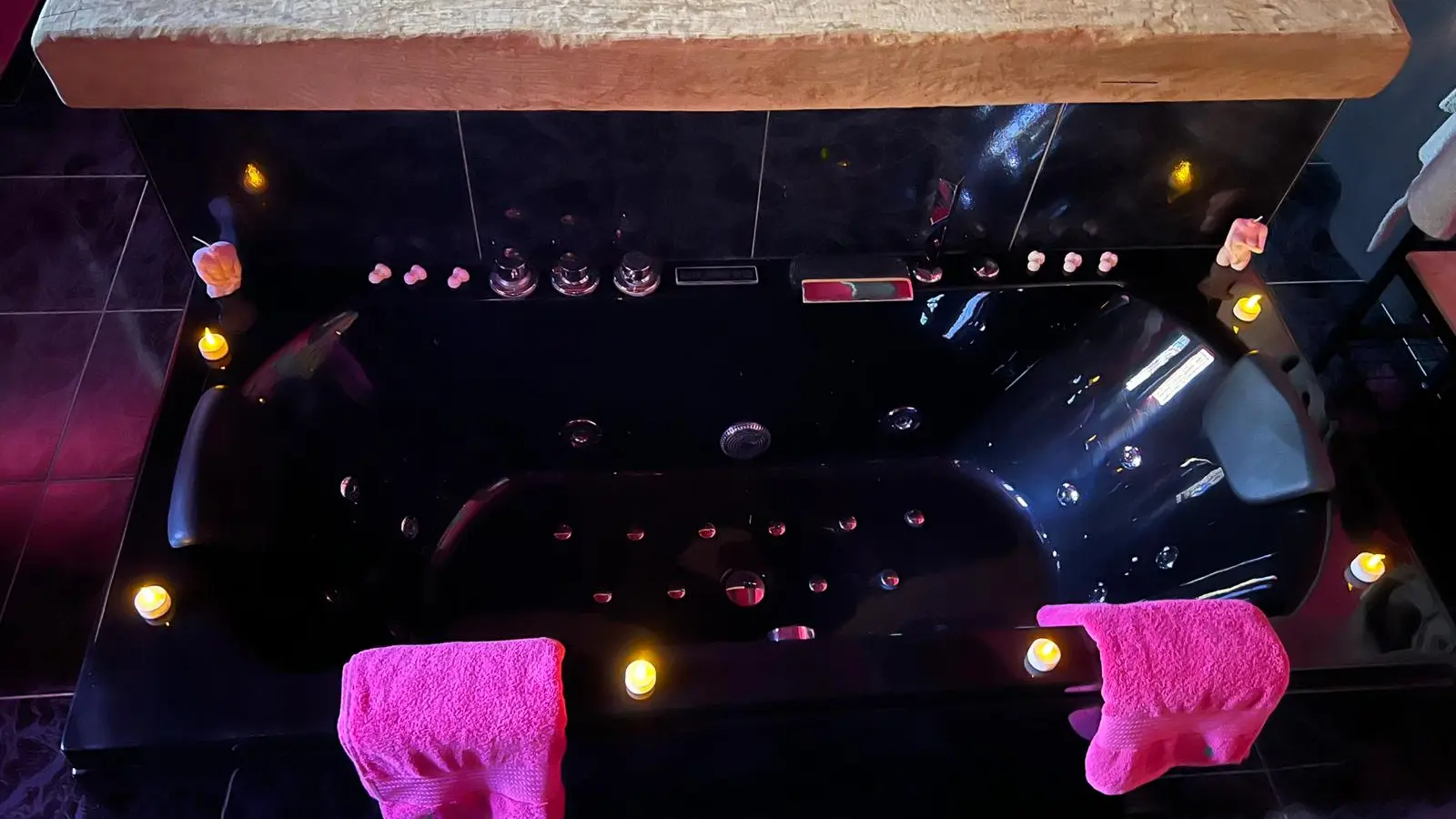Venez découvrir « la chambre rose » climatisée avec ambiance tamisée et sa salle de bain ouverte avec douche et baignoire balnéo.