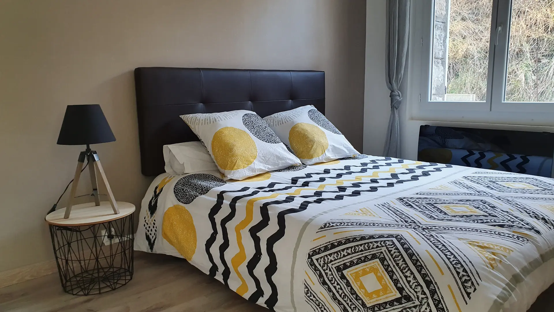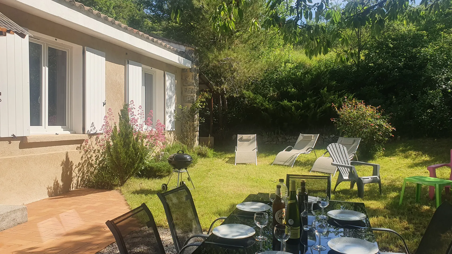 Transat, barbecue, vue dégagée sur les montagnes.
