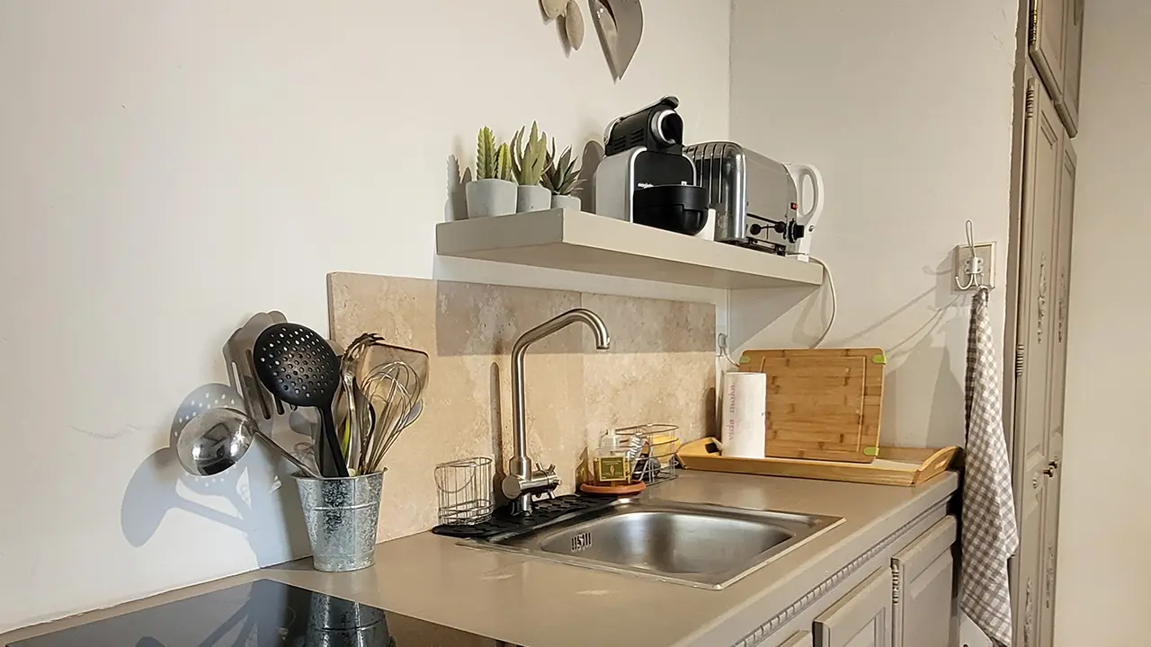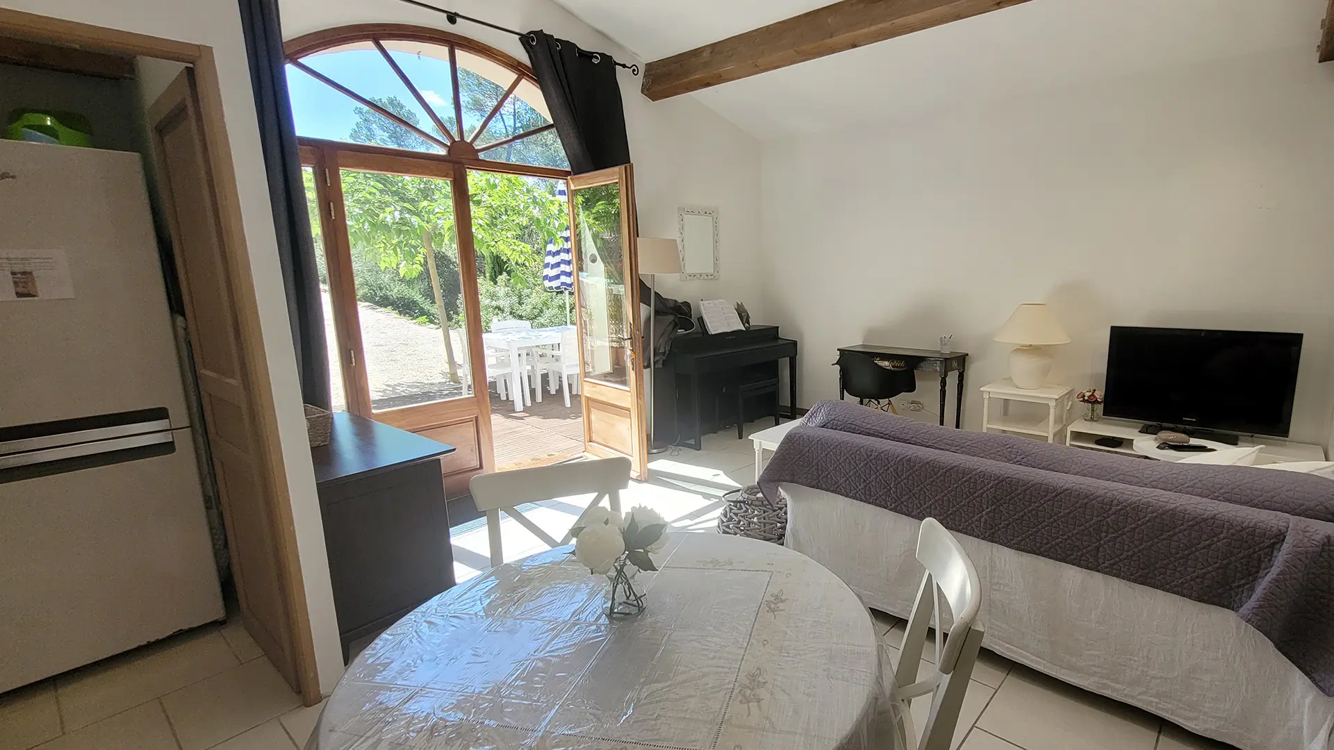 Déco de charme, tout confort : grand séjour, piano, coin cuisine, 1 chambre avec 1 lit 2 places et canapé convertible, salle de bain avec WC.