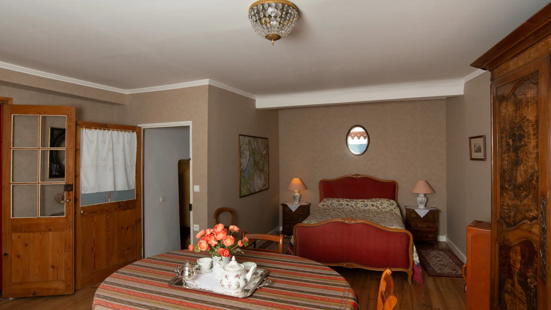 Deux grandes chambres communicantes (30 et 26 m2), une terrasse de 24 m2 avec une vue splendide et une grande salle de bain (13 m2) avec toilettes. La première chambre est équipée d'un lit en 140 et la seconde d'un lit en 150 ; ce dernier n'a pas de "pied de lit" et permet un couchage confortable des personnes de grande taille. La salle de bain est attenante à l'une des chambres. Une petite pièce également attenante à cette même chambre est équipée d'un petit réfrigérateur, d'une machine à expresso et de vaisselle. L'ensemble, au premier étage de la maison, vous est réservé pendant votre séjour.